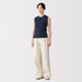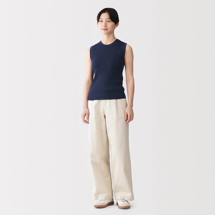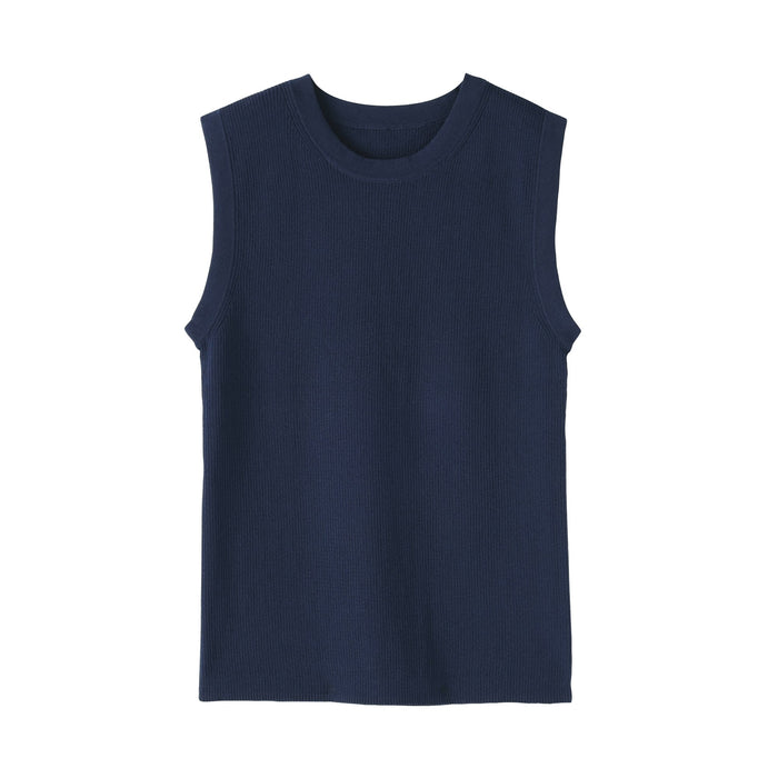 A women's sleeveless sweater made with lightweight, airy cotton blend material that is perfect for wearing in warmer weather.