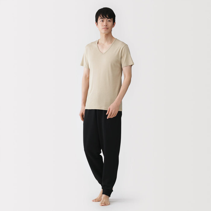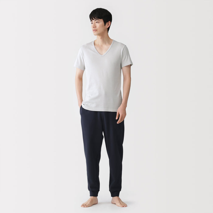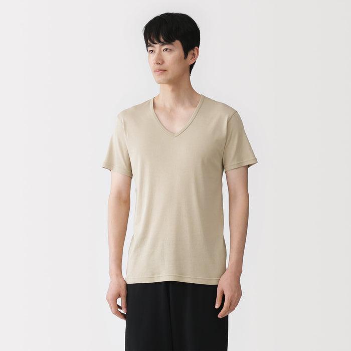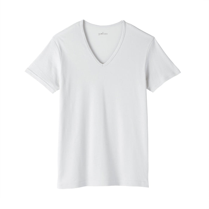 A men's V-neck undershirt made from a smooth, breathable organic cotton material that is lightweight and feels cool on the skin, making it comfortable to wear even in warm weather. The design has been improved with a thinner and flatter neckline that won't show through outer tops. To prevent irritation, care labels and tags are printed on the inner side of fabric.