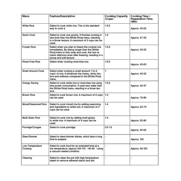Choose from 13 specialized cooking modes tailored to your ingredients and preferences such as small portions, frozen rice, brown rice, multigrain blends, mixed rice, stews, porridges/congees, low-temperature options, and energy saving settings. The built-in self-cleaning steam function for the lid keeps daily maintenance simple. Cook healthy, delicious meals for your family with ease and confidence.