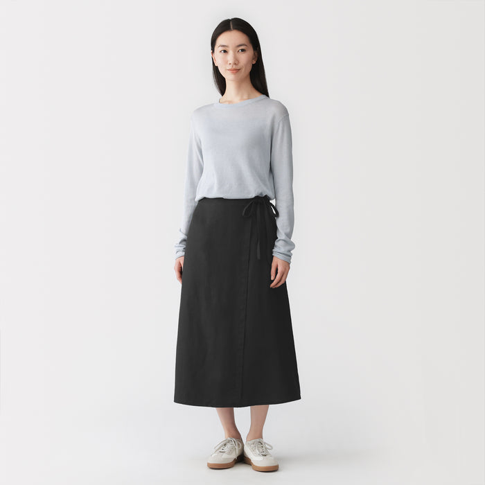 This wraparound midi skirt is a stylish and versatile piece for any spring wardrobe. Made with a blend of organic cotton and hemp, the fabric is lightweight and features a soft fluffy texture. The skirt ties at the front hip to add an effortless, charming detail.