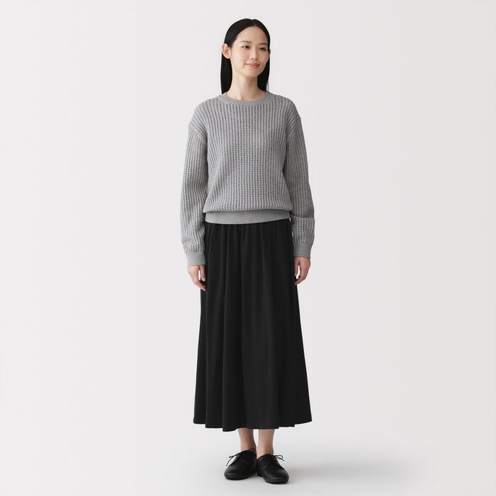This long, gathered skirt is a relaxed design that makes the most of the smooth texture and drape of the material. It has a clean and elegant silhouette, combining ample volume with ease of movement.
