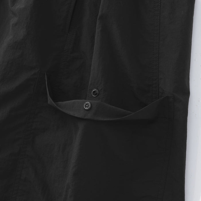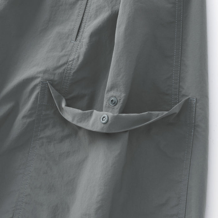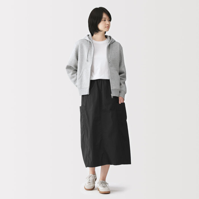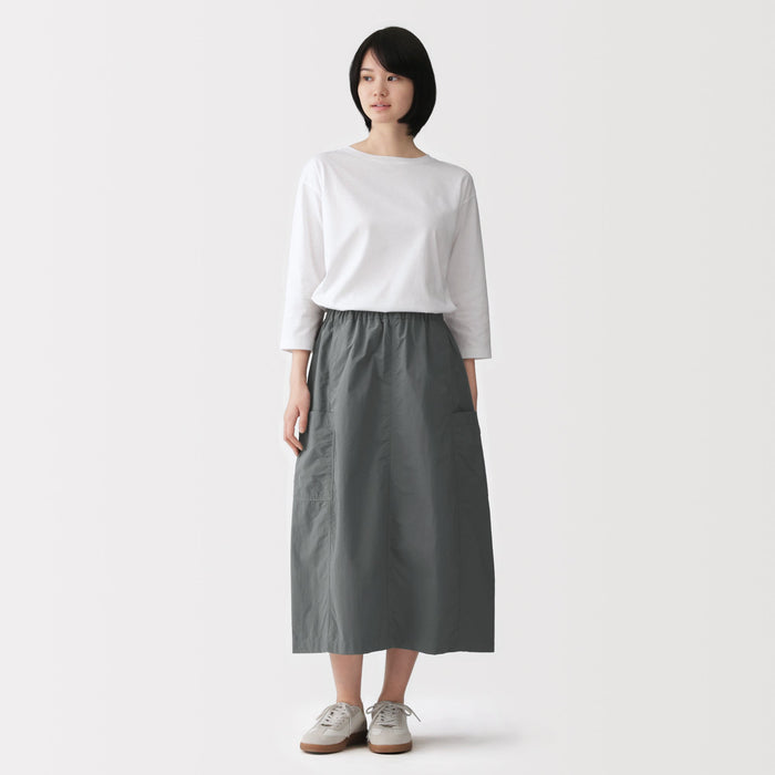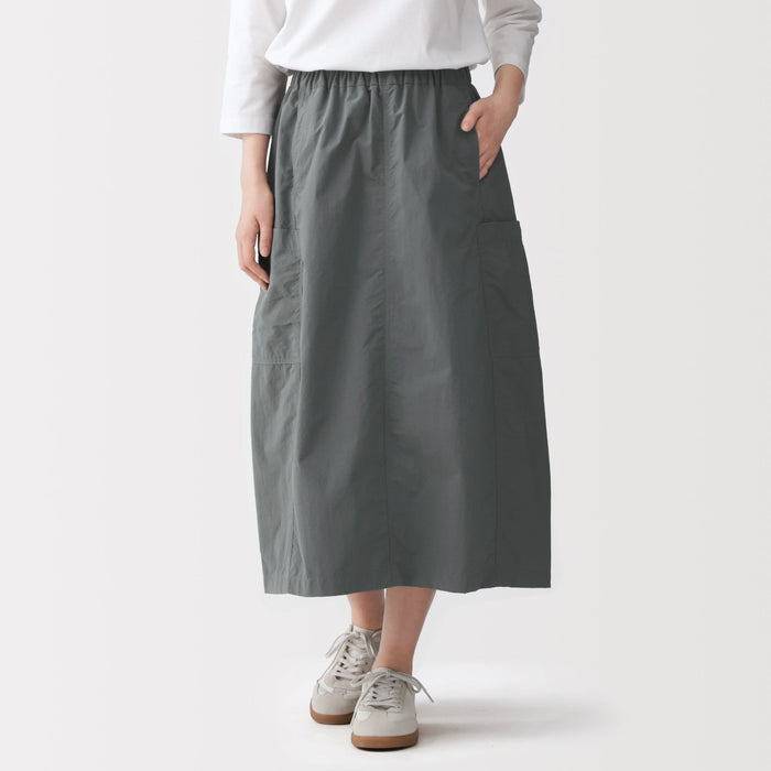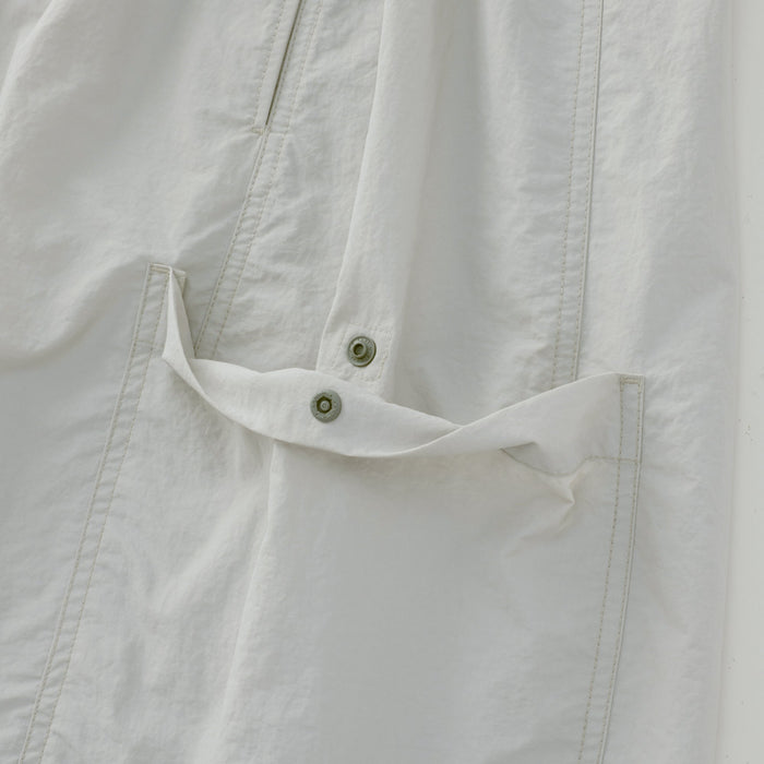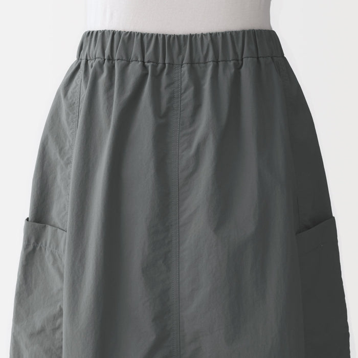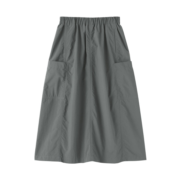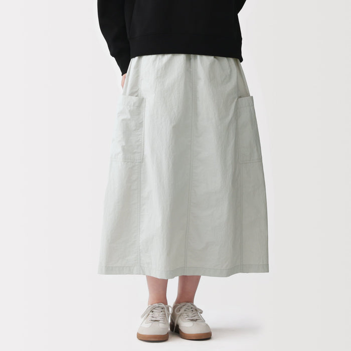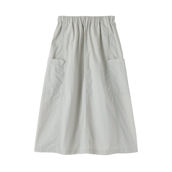 This midi skirt is made from lightweight, water-repellent nylon material that has been given a wash treatment to create a natural lightly wrinkled texture. It is a casual piece that is calf-length and finished with a subtle cocoon silhouette, so it can easily be coordinated with a variety of outfits. It features large cargo-style pockets on the sides that are convenient for holding items.