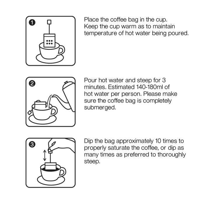 - Pour hot water and steep for 3 minutes. Estimated 140-180mL of hot water per person. Please make sure the coffee bag is completely submerged.