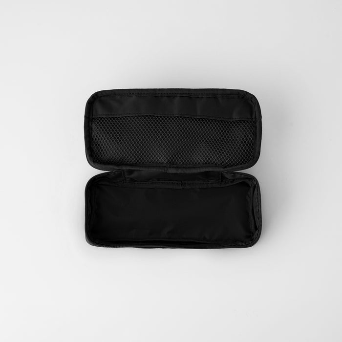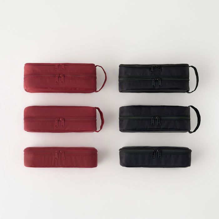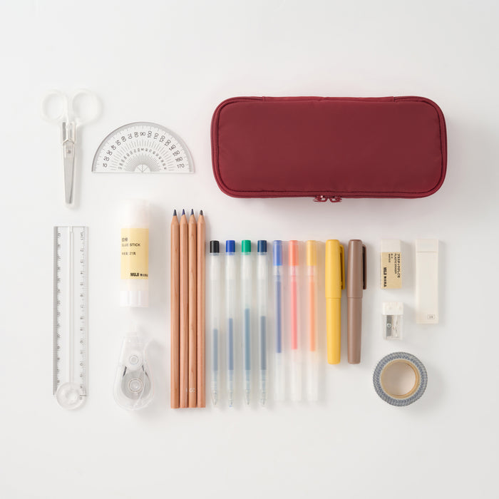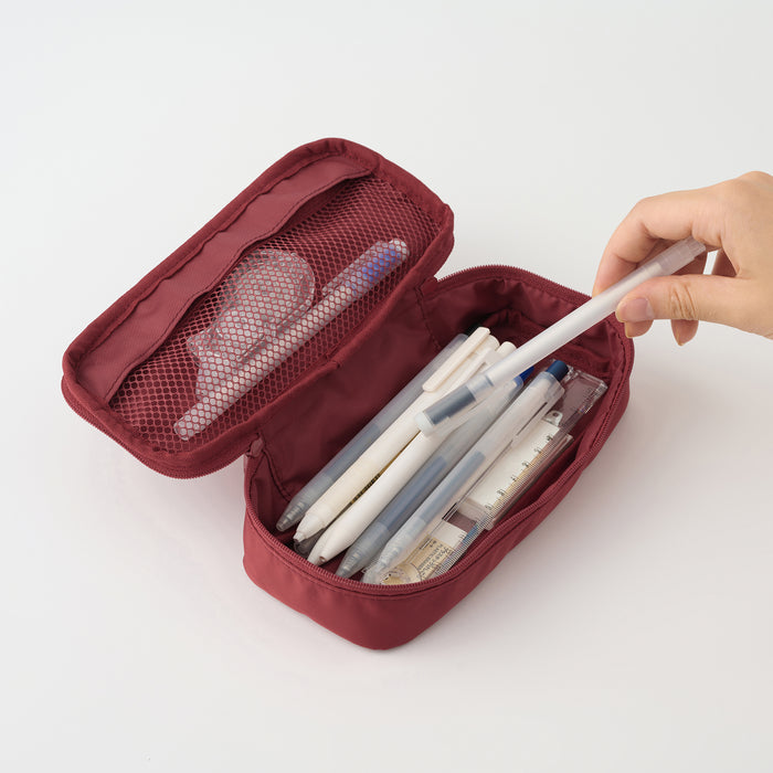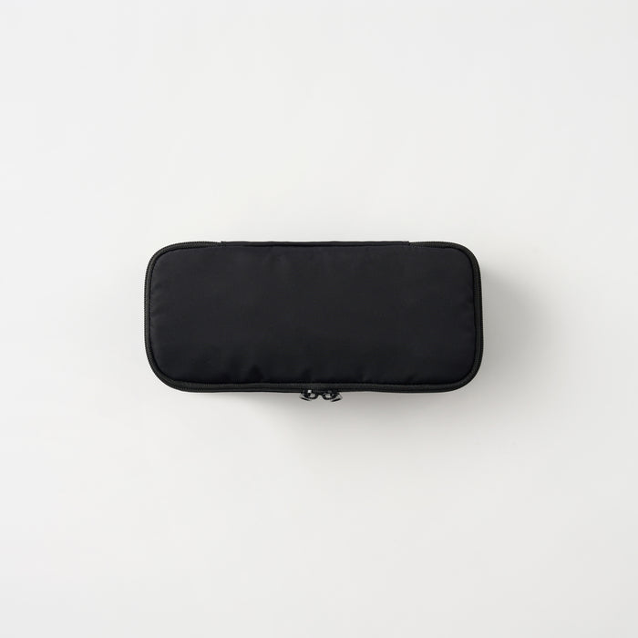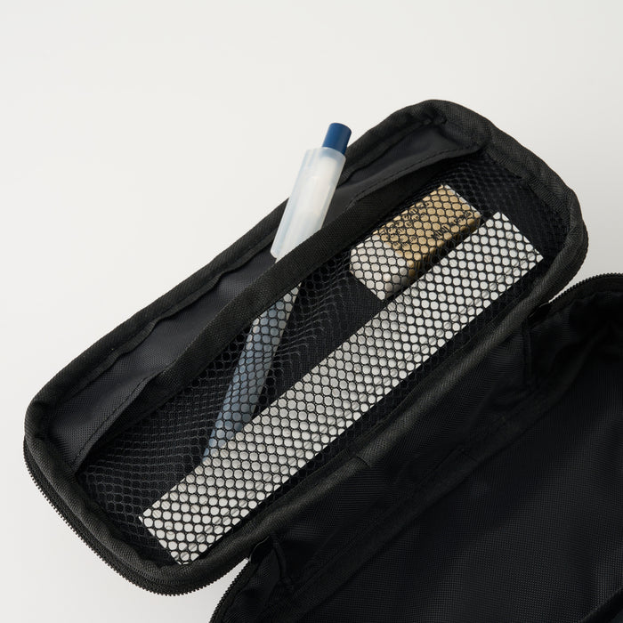 A pen case made of light and durable nylon fabric, with inner pockets that allow for large-capacity, organized storage. It has a convenient double-ended zipper, and its top opening design makes it easy to access items.