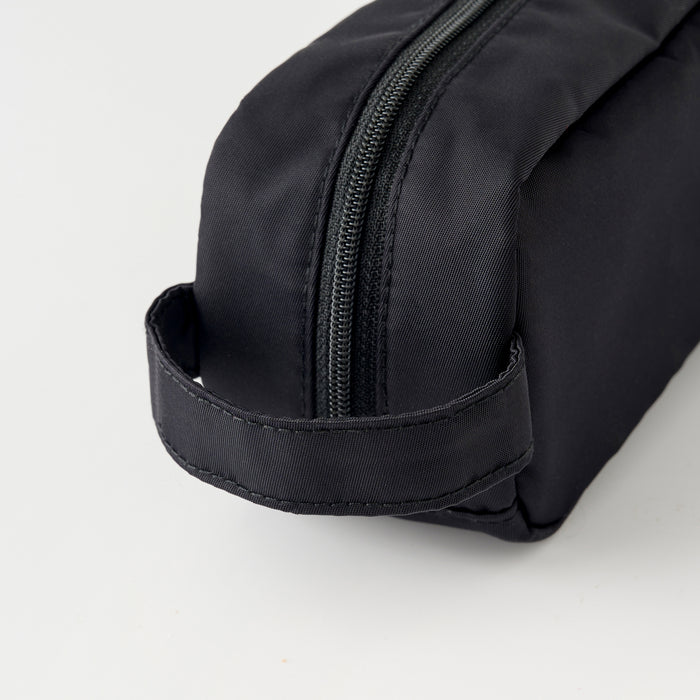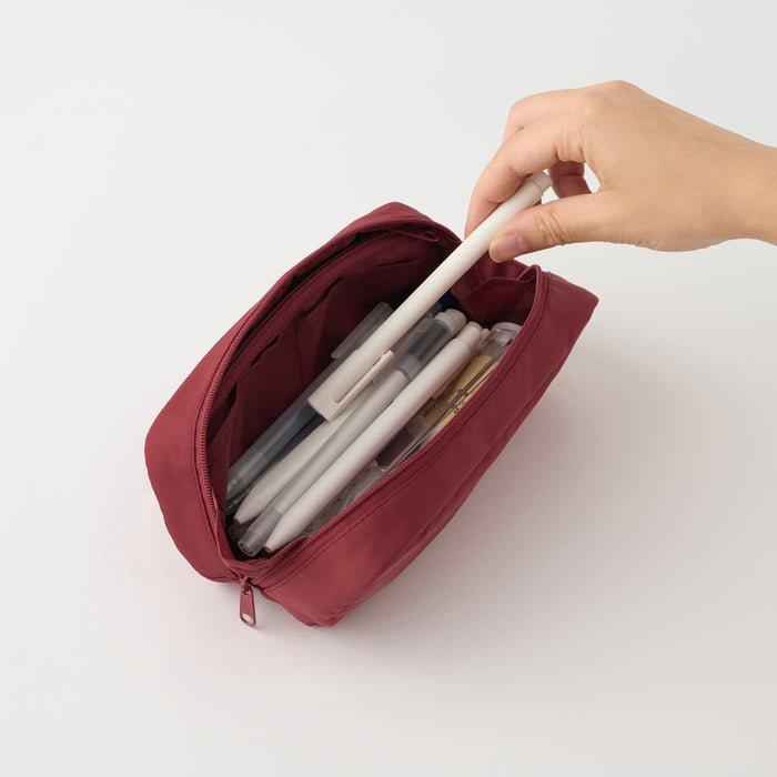 A pen case made of light and durable nylon fabric, with a convenient handle and a gusset that allows it to stand on its own. Its inner pockets allow for large-capacity, organized storage. The wide opening design makes it easy to access items.