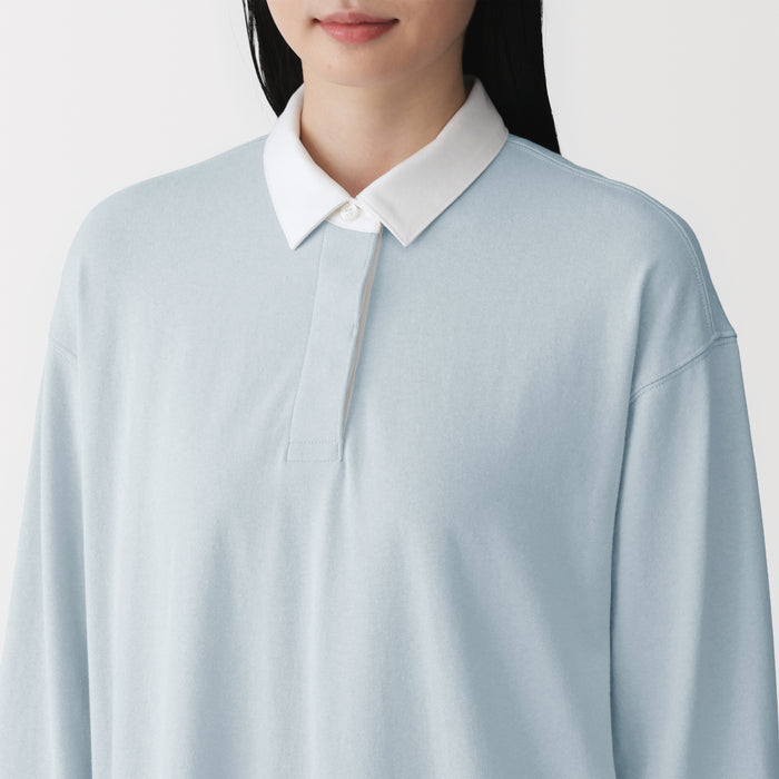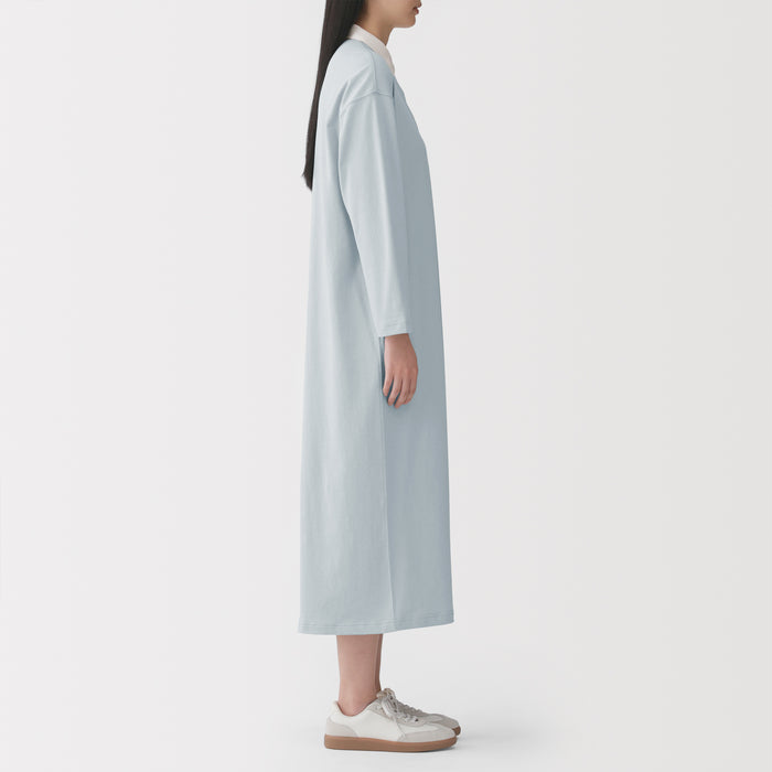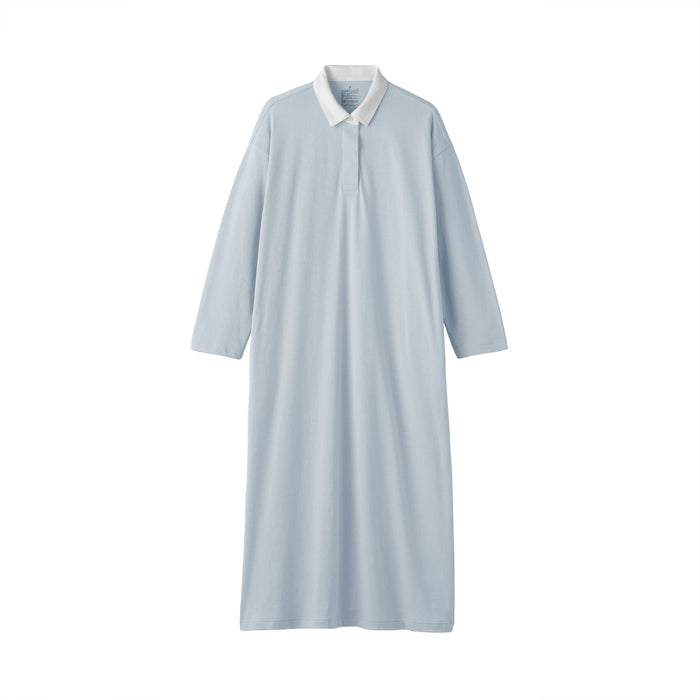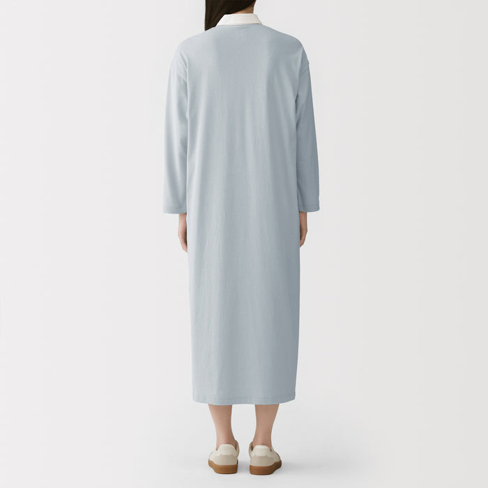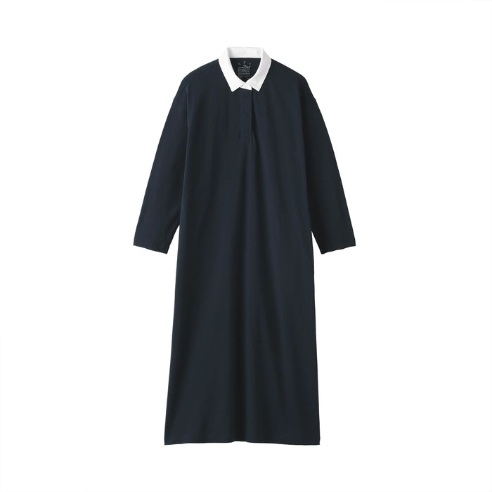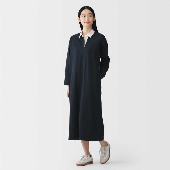 This dress features a 2-ply jersey knit design, with two strands of organic cotton yarn intricately woven together to create a soft and moderately thick fabric. It features a classic rugby-style collar.