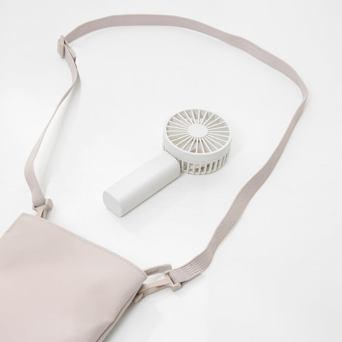The fan has holes on the bottom that allows a strap (not included) to be attached.