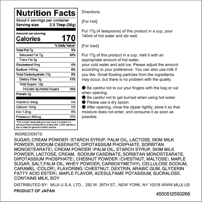 Sugar, Cream powder (Starch syrup, Palm oil, Lactose, Skim milk powder, Sodium caseinate, Dipotassium phosphate, Sorbitan monostearate), Cream powder (Palm oil, Starch syrup, Skim milk powder, Lactose, Cream, Sodium Caseinate, Sorbitan Monostearate, Dipotassium phosphate), Chestnut powder (Chestnut, Maltose), Maple sugar, Salt, Palm oil, Whey powder, Carboxymethyl cellulose sodium, Caramel (color), Flavoring (Chestnut, Dextrin, Arabic gum, Glycerin fatty acid ester), Maple flavor, Acesulfame potassium, Sucralose.