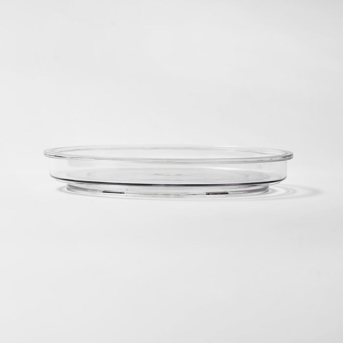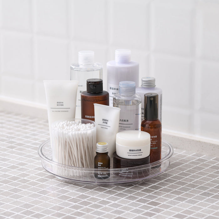 This convenient round tray has a smooth turntable design that allows for quick and easy access to items. Made of a lightweight and transparent PET material that matches any space, it is perfect for storing skincare or organizing the kitchen and fridge.