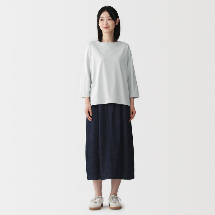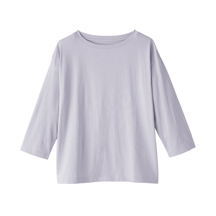 A women's boat neck T-shirt with 3/4-length sleeves, made from a soft and smooth cotton blend that feels comfortable on the skin. The wide neckline and moderately loose sleeves allow for comfortable and easy movement.