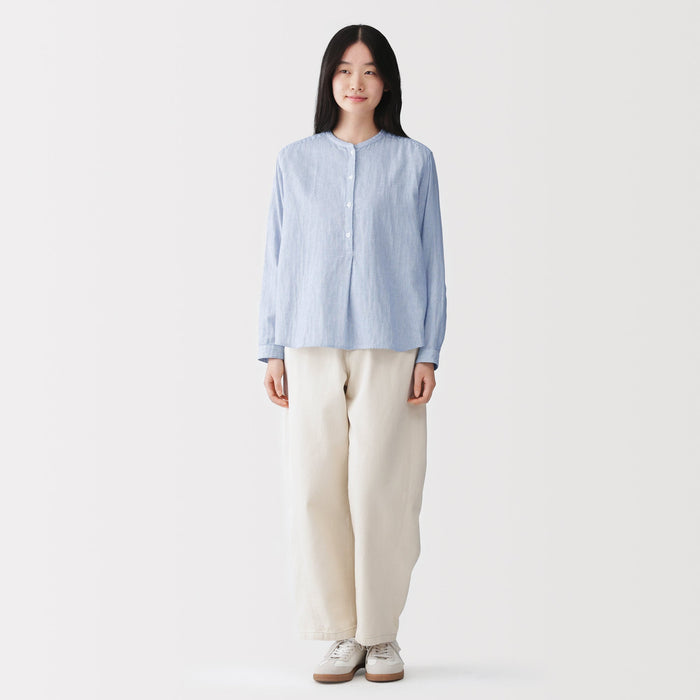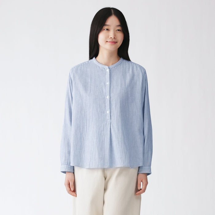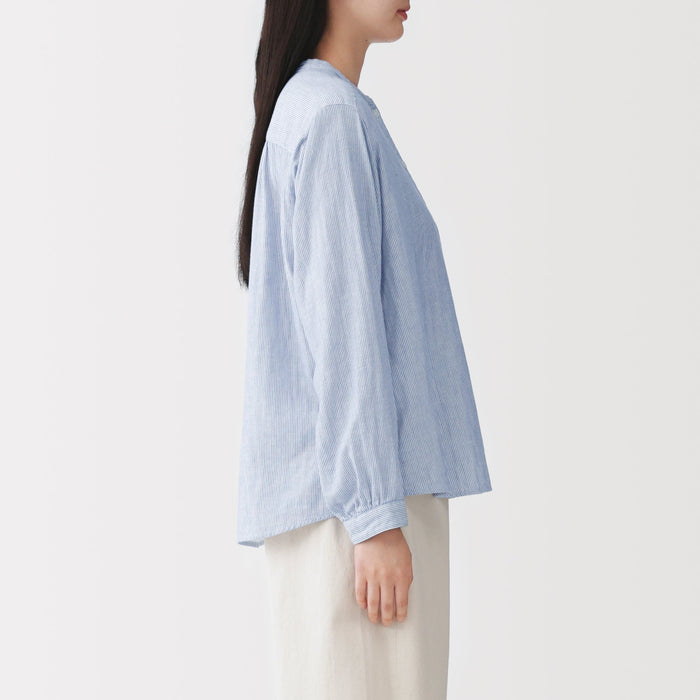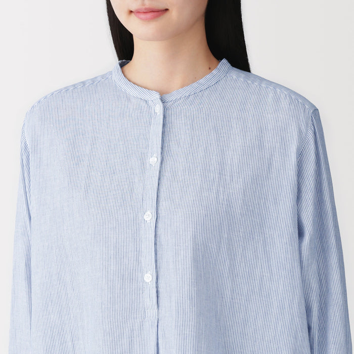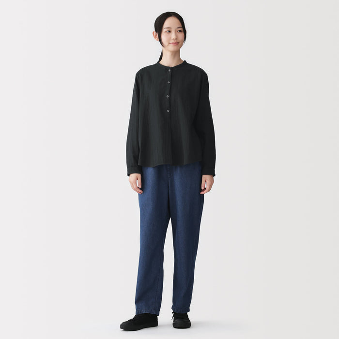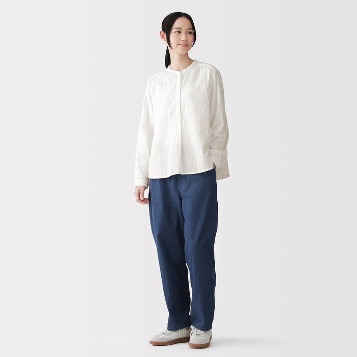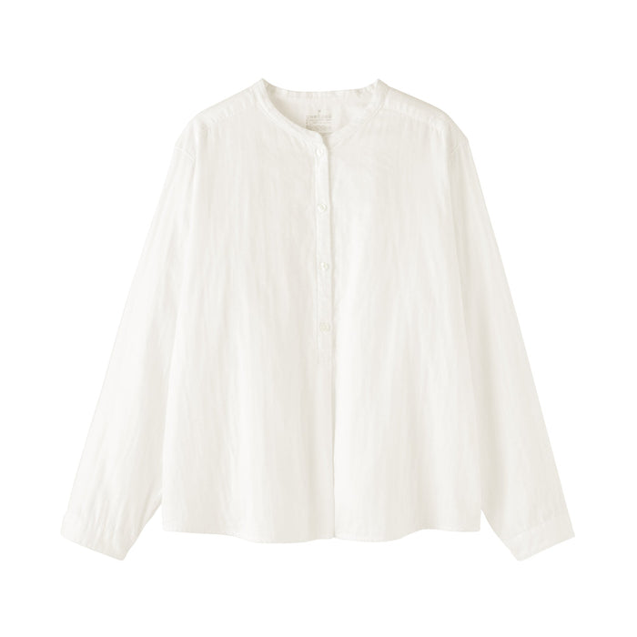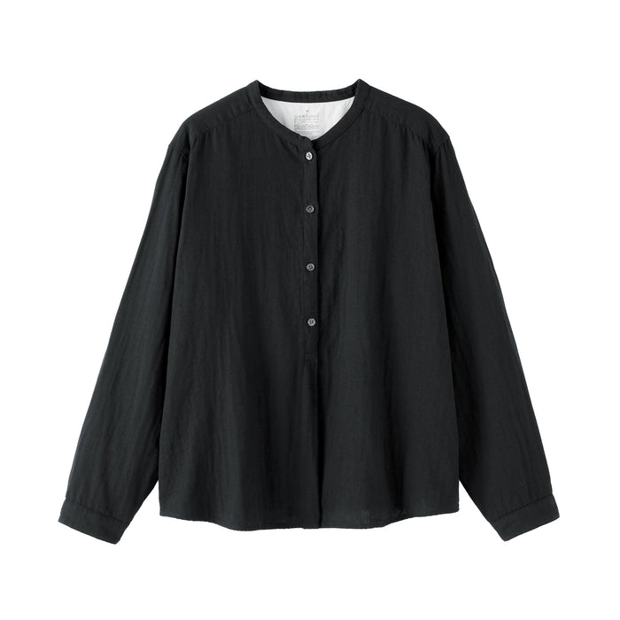 A women's long sleeve blouse with a clean stand collar and loose silhouette. The front has a basic, elegant design, while the back has gathers in the back for a softer look. Its double layered structure traps air between the gauze, making it lightweight and breathable.