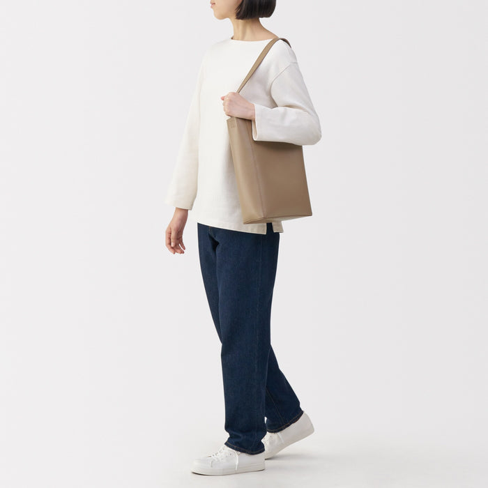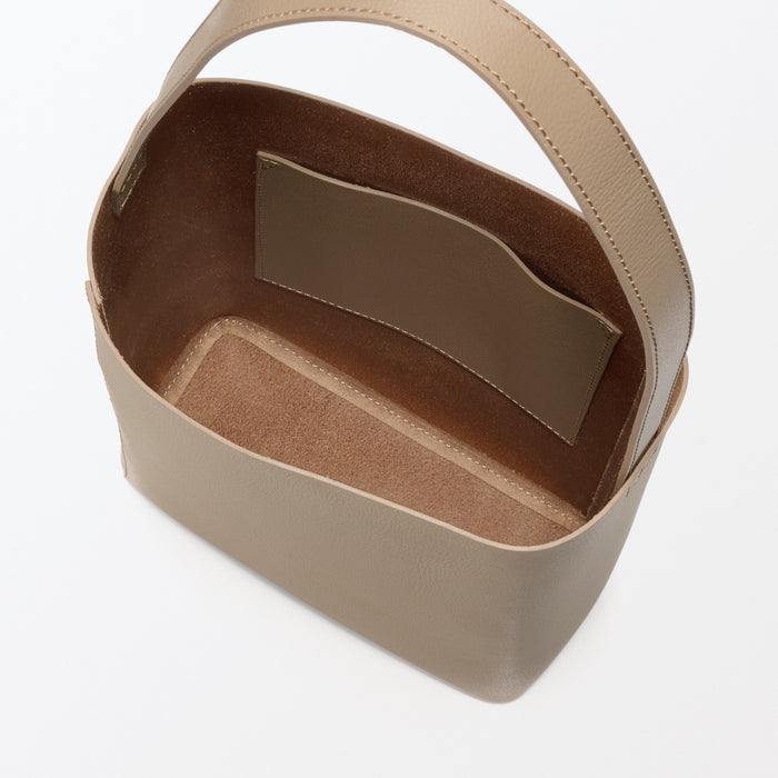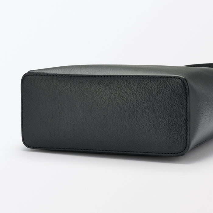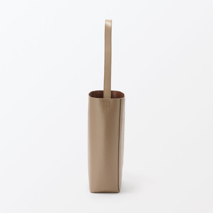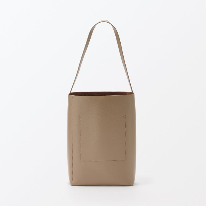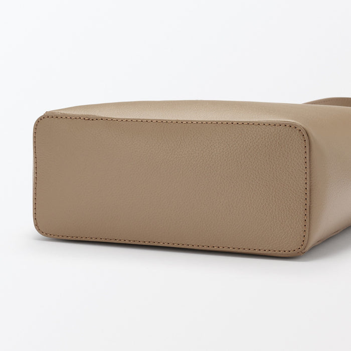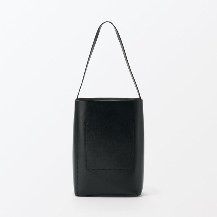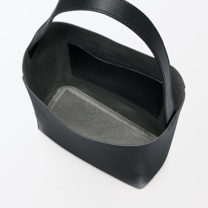 This sleek one-shoulder bag is made from genuine leather tanned with vegetable tannins. The leather becomes softer with use over time, allowing you to enjoy the natural texture. It is designed a flat bottom that allows it to stand on its own, and there is an interior pocket for organization.
