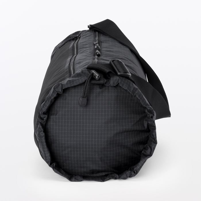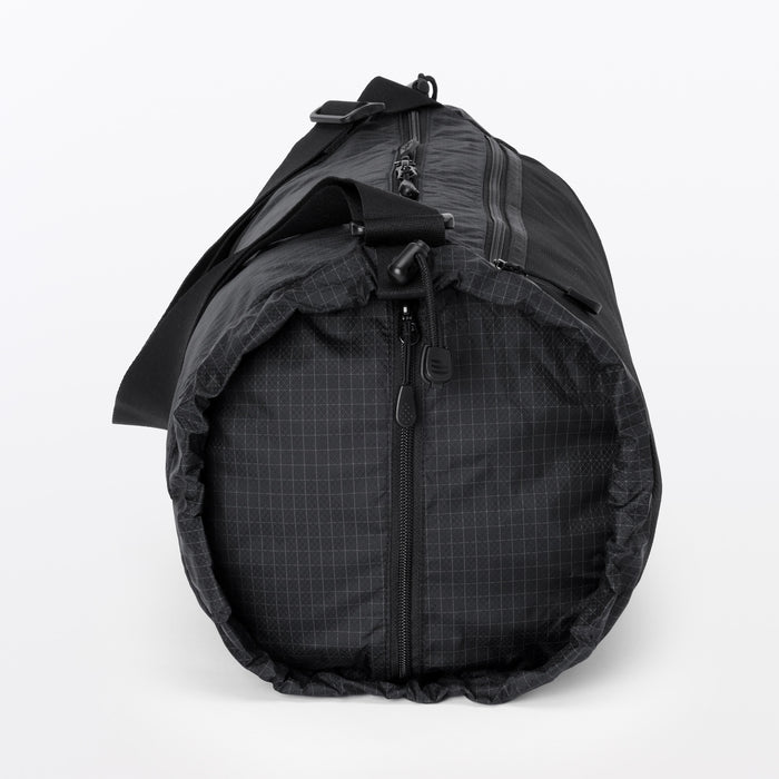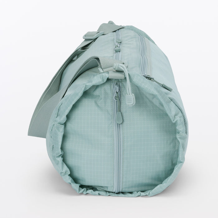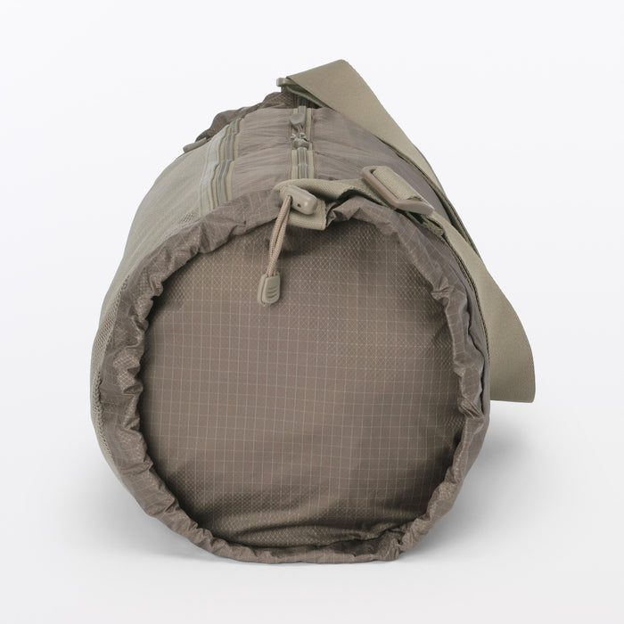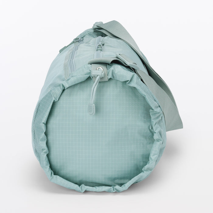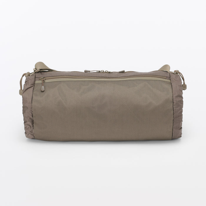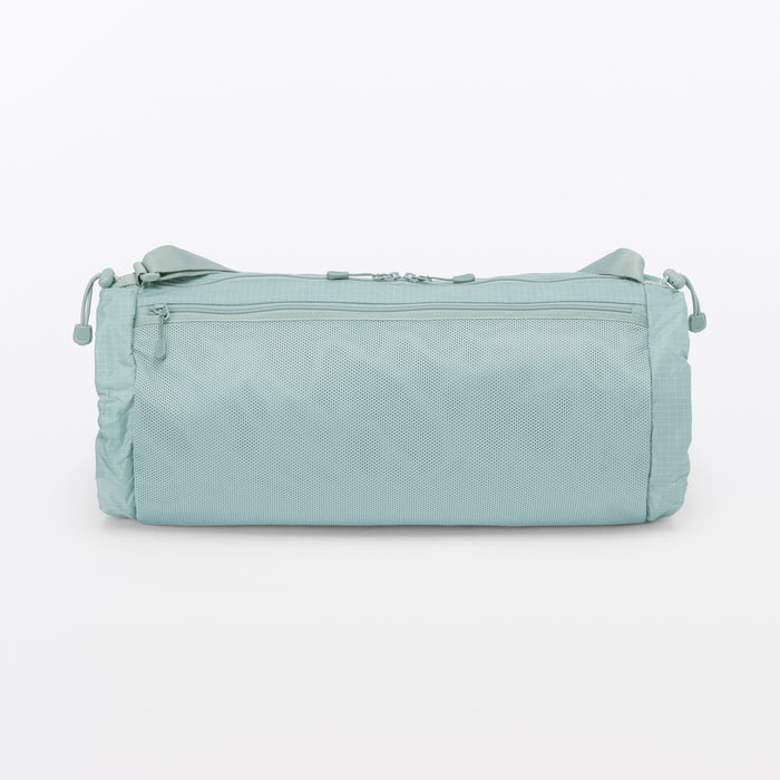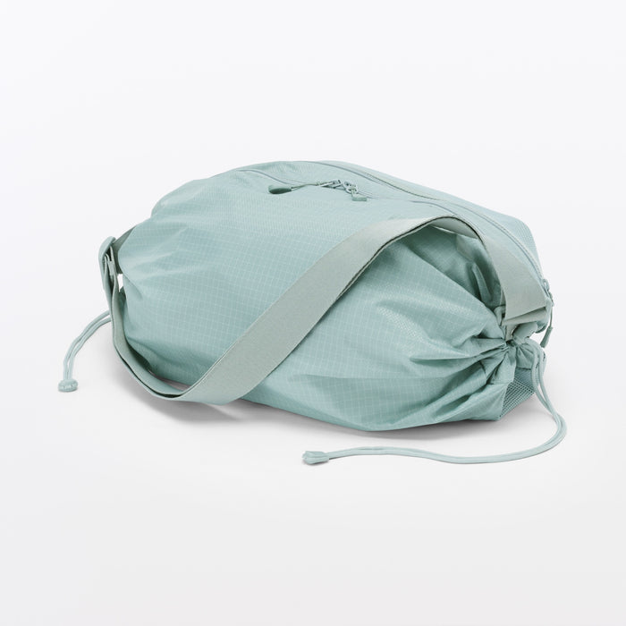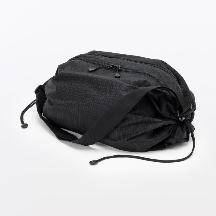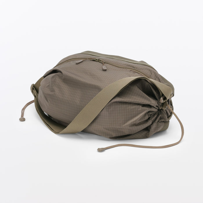 This shoulder bag is made of lightweight and durable ripstop fabric, featuring drawstrings on the ends that allow you to change its shape. There is also a pocket at the side that makes it easier to take things out when wearing. It has a basic design that can be used for a wide range of occasions, from everyday use and going to the gym, to outdoor activities like hiking. Wearable on your shoulder or as a crossbody, it is also great as a secondary bag for travel.