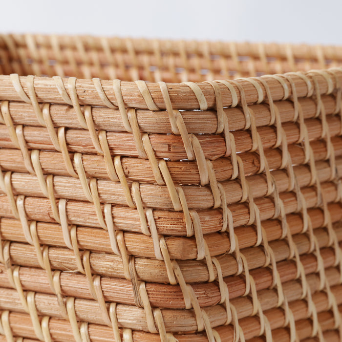 Each Rattan Basket is individually handwoven in Vietnamese tradition with uncoated rattan, a durable, light, and smooth material making it a natural perfect storage solution. These boxes are designed to be stackable so you can store them on top of each other, and easily carry and move them around thanks to its built in handles.