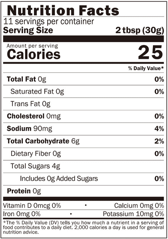 INGREDIENTS: Water, White Grape Juice Concentrate, Premium White Miso Paste (rice, water, soybeans, sea salt, alcohol), Apple Cider Vinegar, Honey, Yuzu Juice, Corn Starch, Gluten Free Soy Sauce (water, soybeans, salt, alcohol)