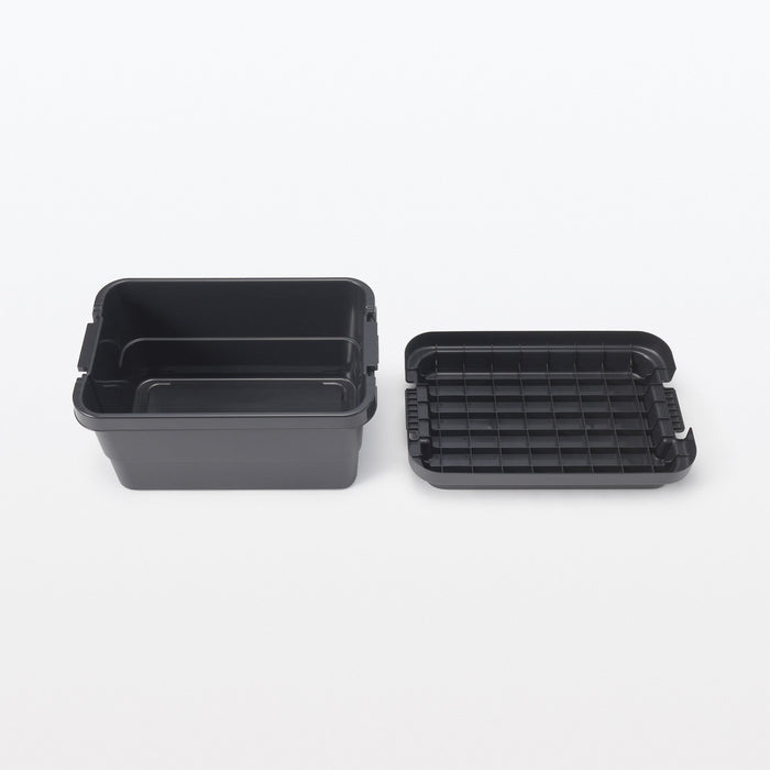 A sturdy storage box made from heavy duty polypropylene that can be used both indoors and outdoors. The bottom features a grid pattern that provides more traction so it does not slip even when stacked, and the lid is designed flat and can be used as a table or seat.