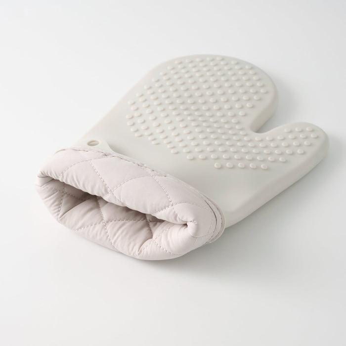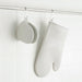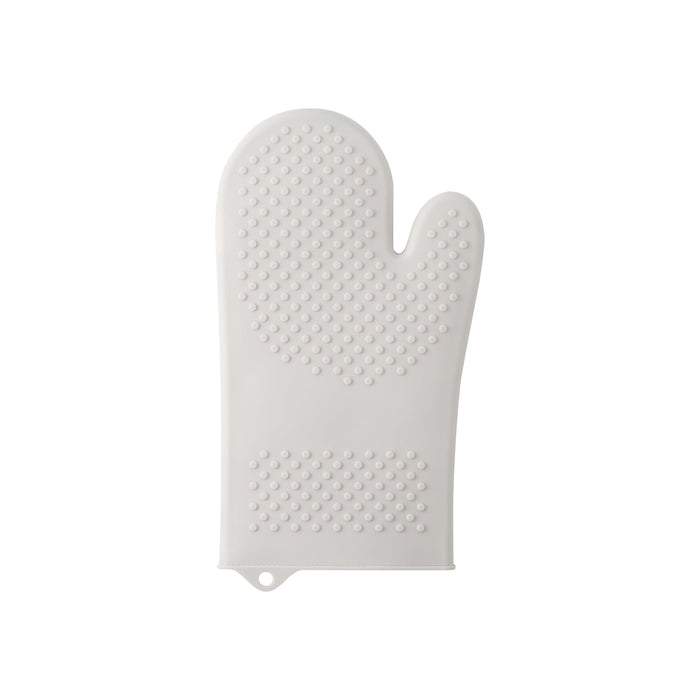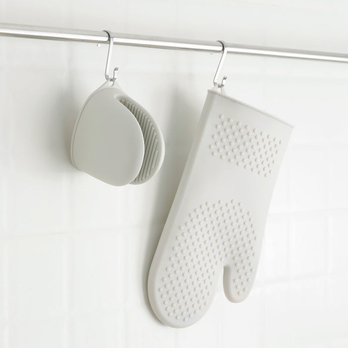 A protective oven mitt designed to keep your hands safe while handling hot cookware and bakeware in the kitchen. Made of food-grade soft silicone that is comfortable to wear, with anti-slip texture designs for easy gripping. The inside is lined with polyester for extra heat protection. Hanging storage holes save space when not in use.
