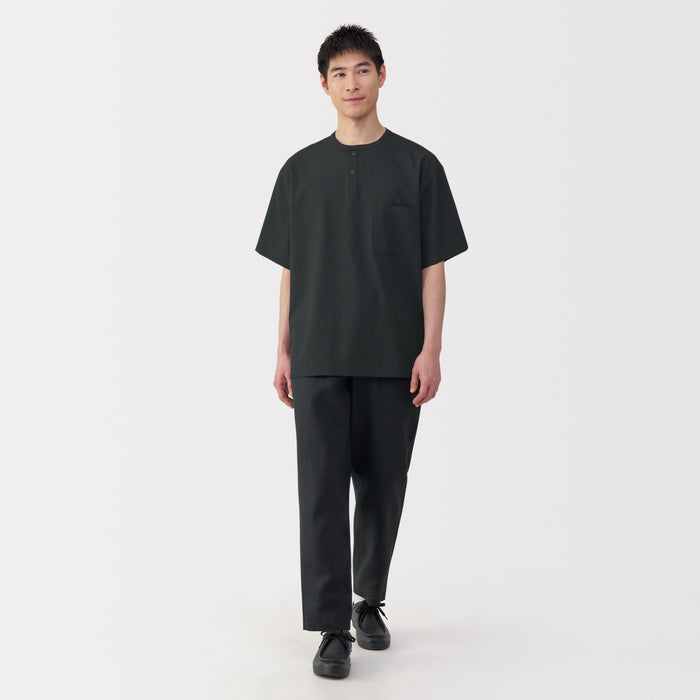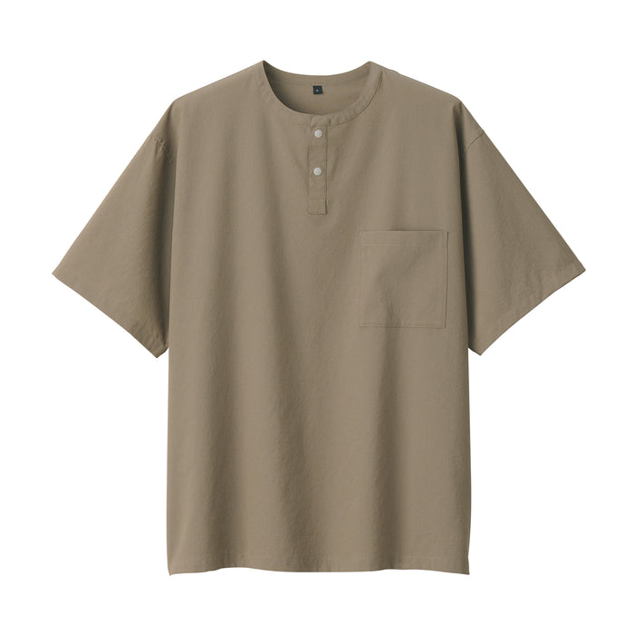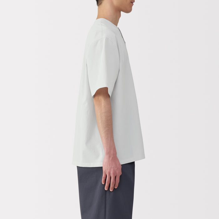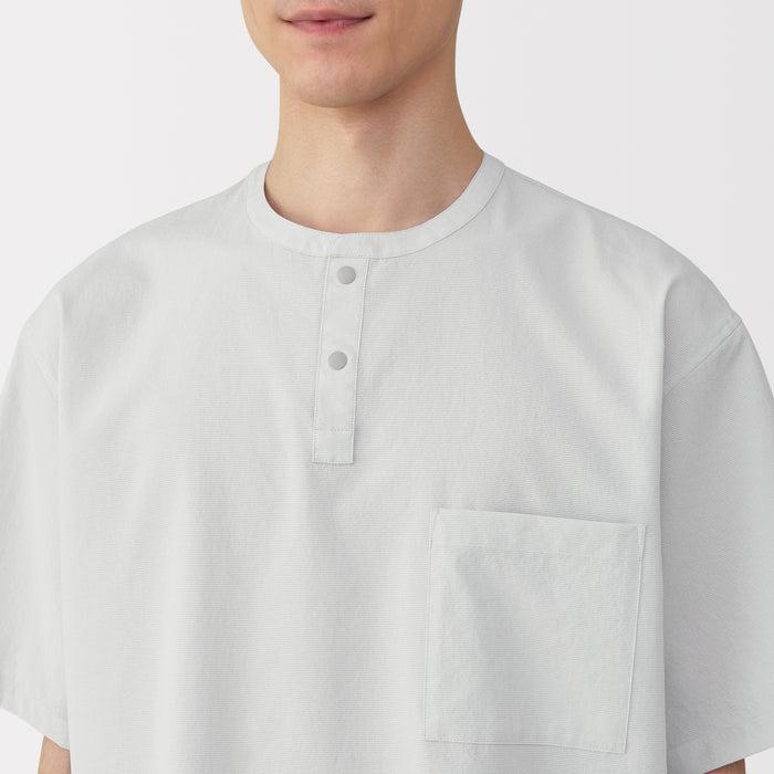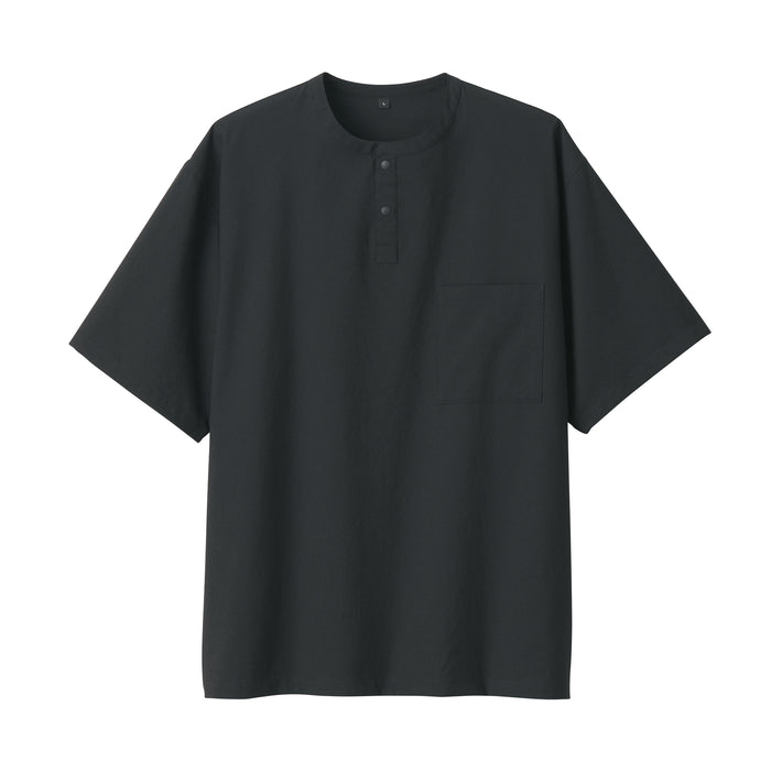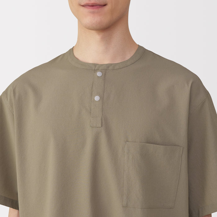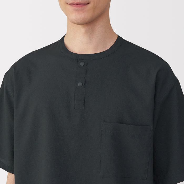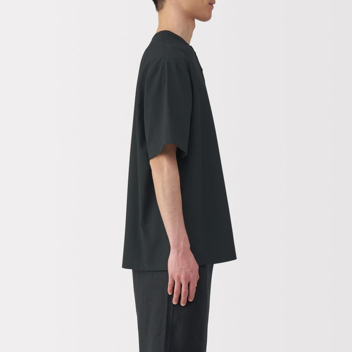 This short sleeve Henley T-shirt is made from an lightweight, quick-drying fabric with tiny ventilation holes created through special processing for breathability. It is designed with a roomy silhouette that is breezy and comfortable to wear on hot days. Made with partially recycled materials.