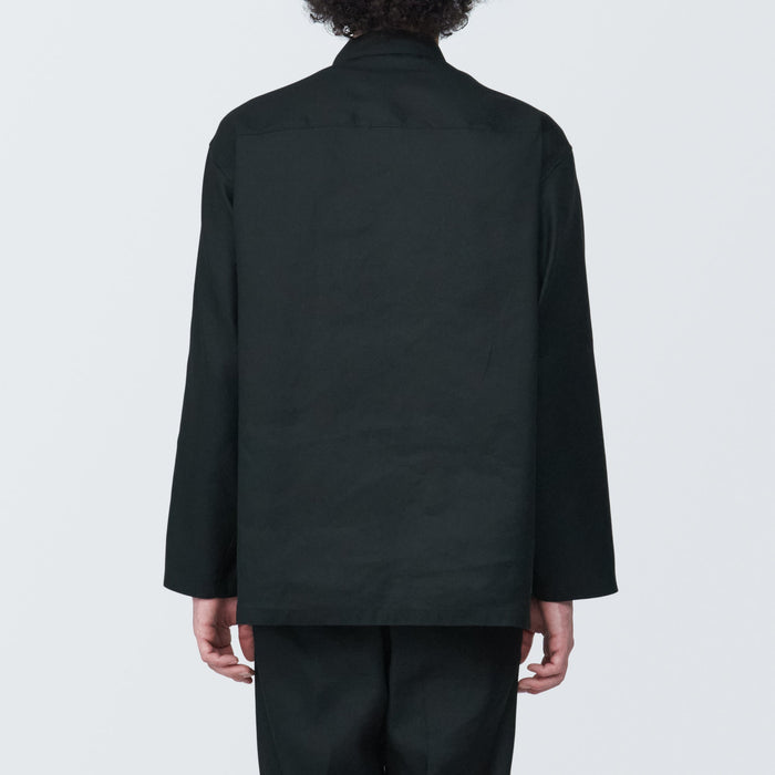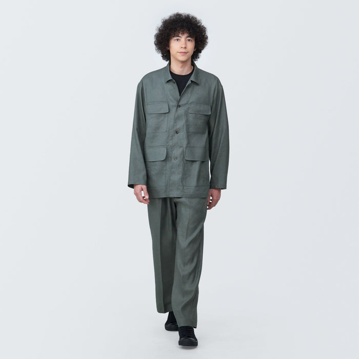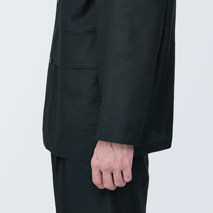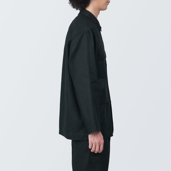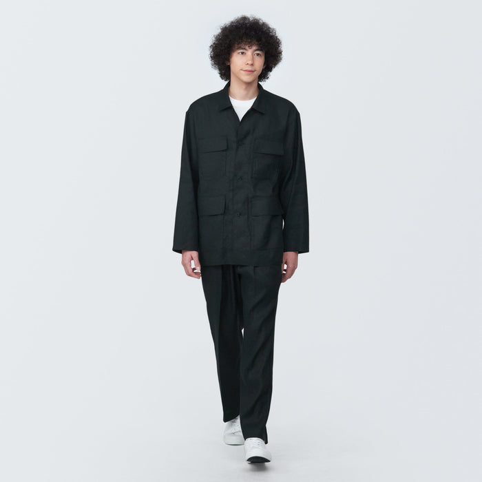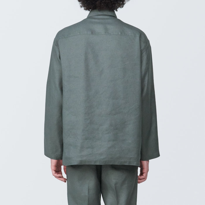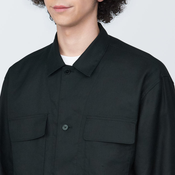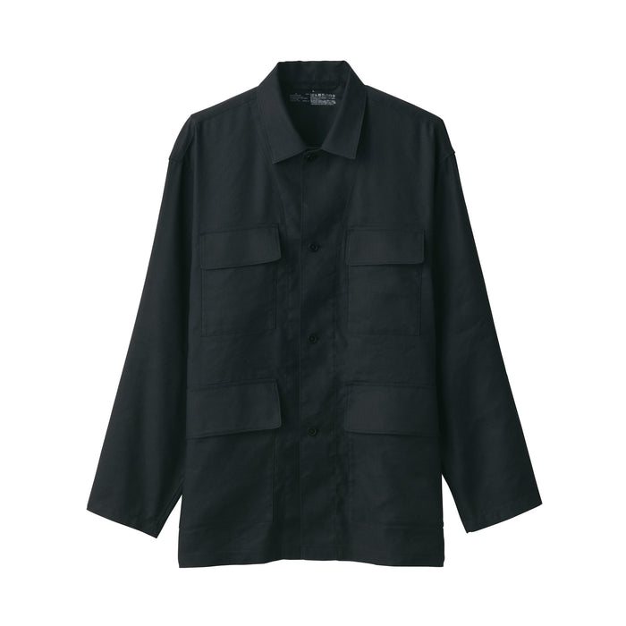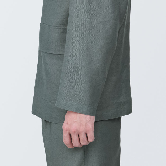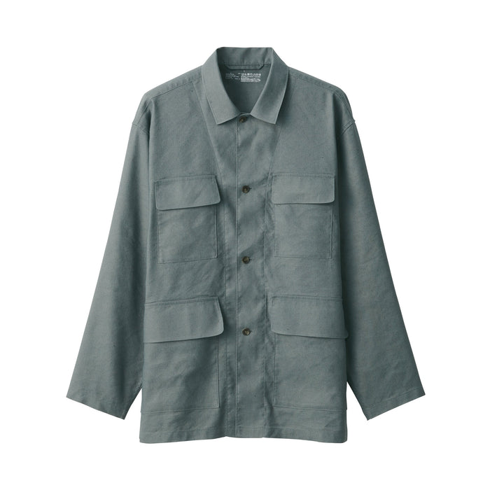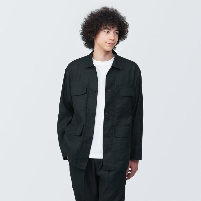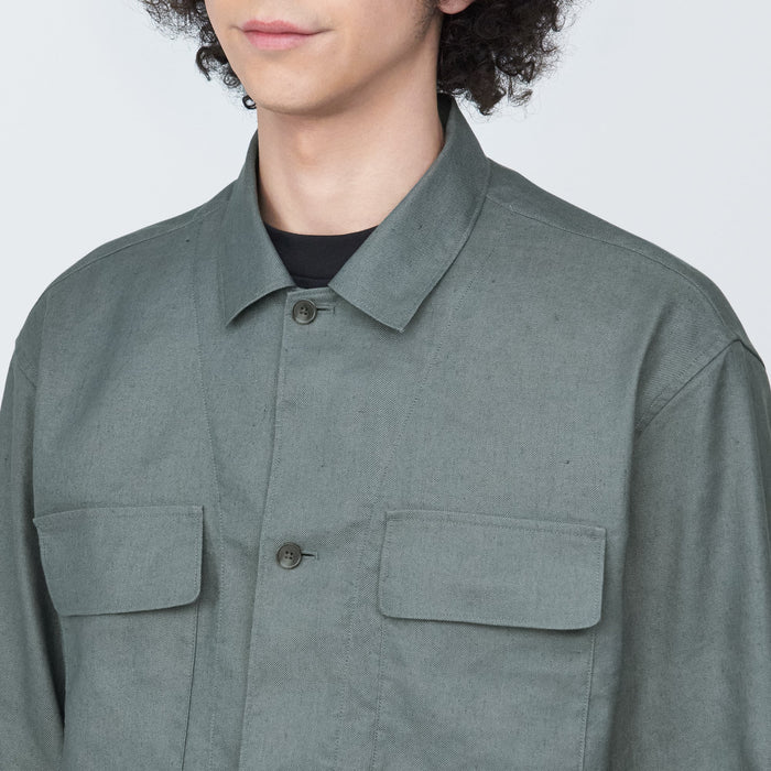 A shirt jacket made using a hemp blend that doesn't crease after washing.