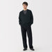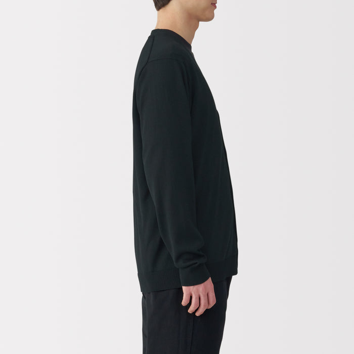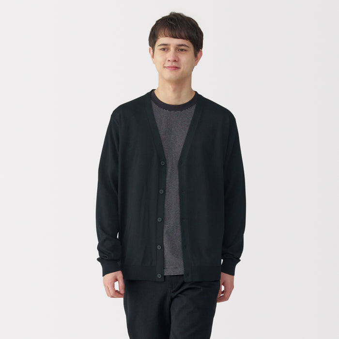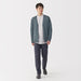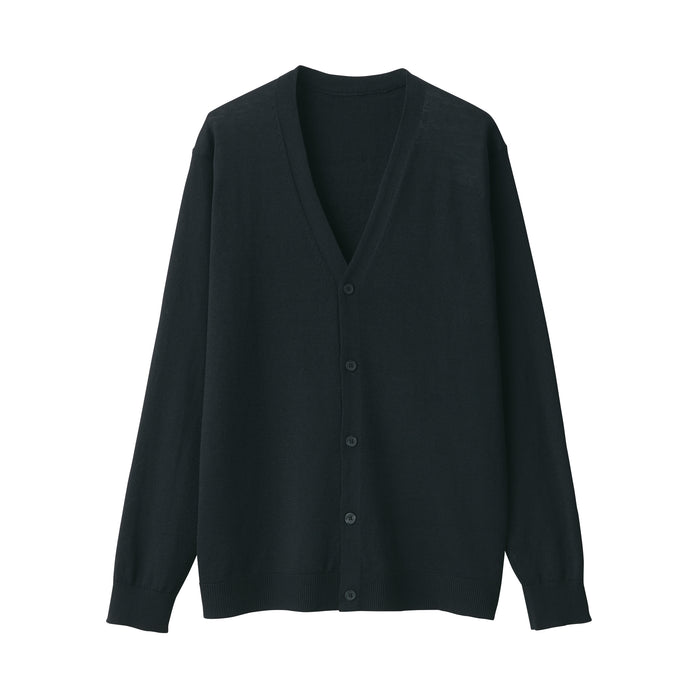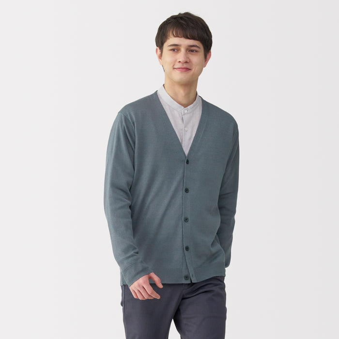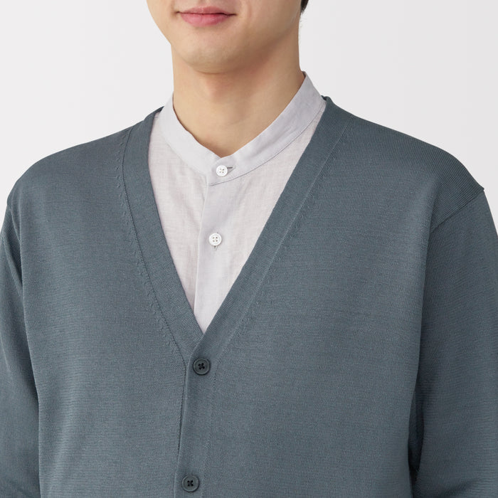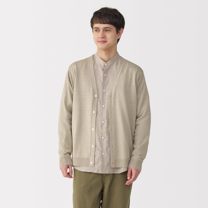 This lightweight men's cardigan is knitted by twisting hemp and elastic yarn together for a smooth texture.