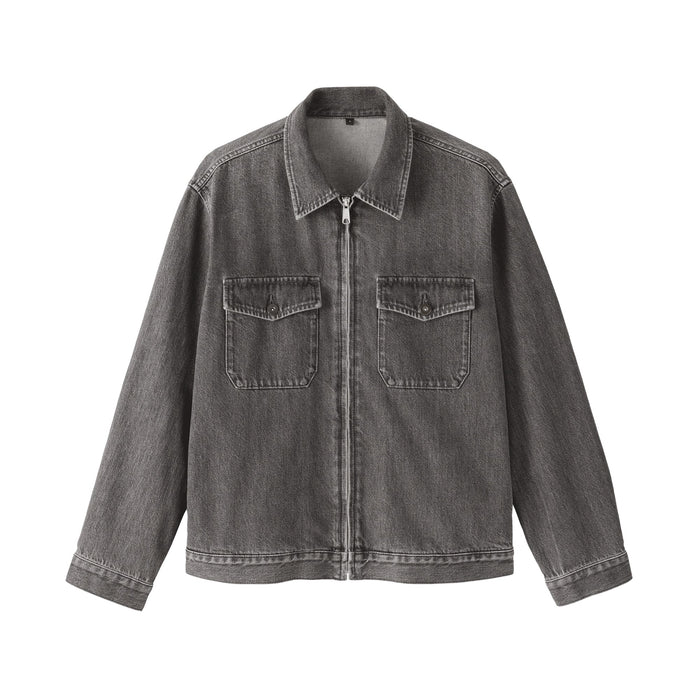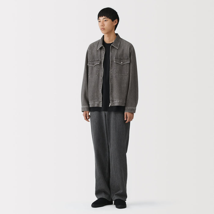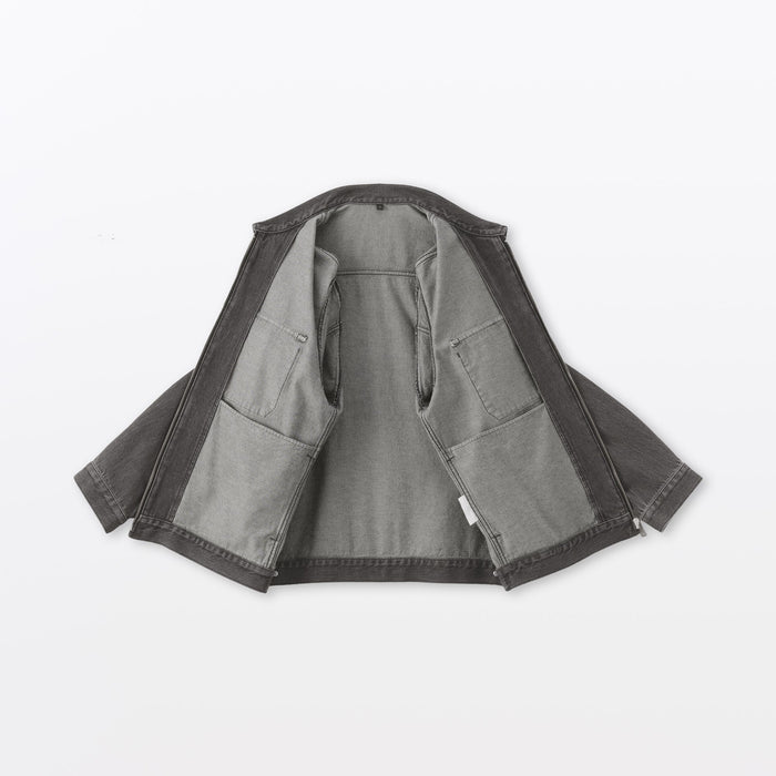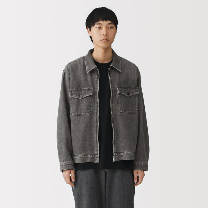 A men's denim zip-up jacket made with a soft, lightweight blend of organic cotton and kapok fiber, an environmentally friendly plant grown without pesticides. By using a fabric that mixes kapok with cotton, it is softer and lighter than conventional 100% cotton.
