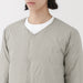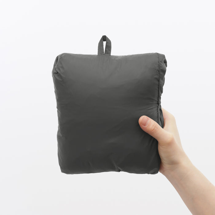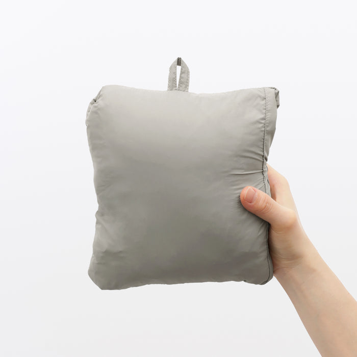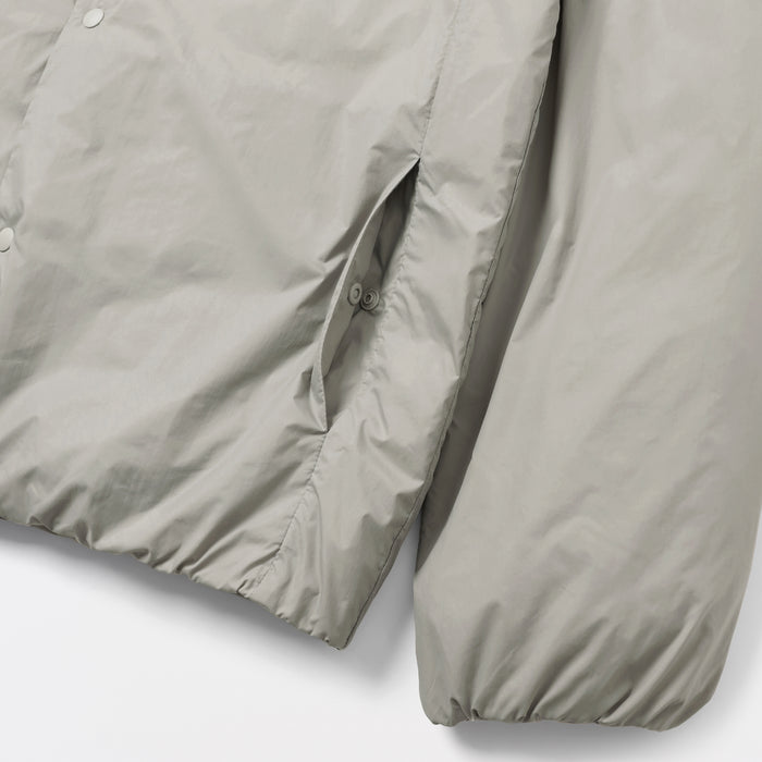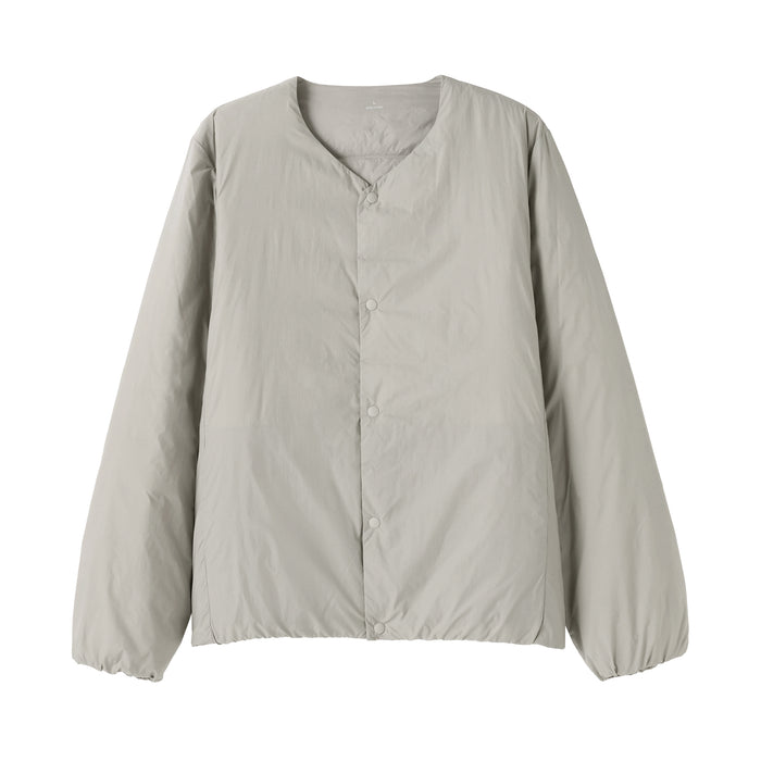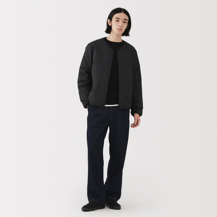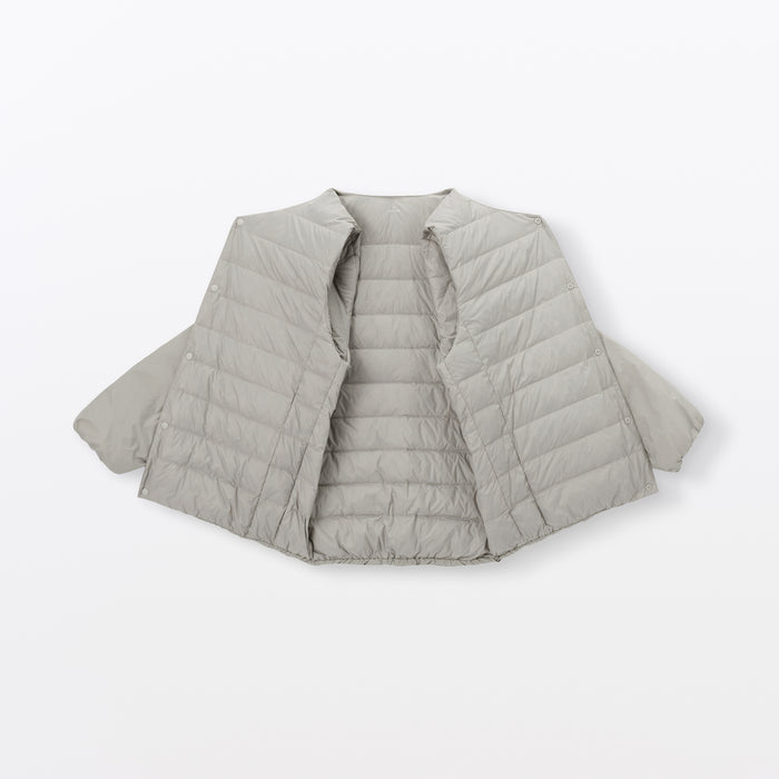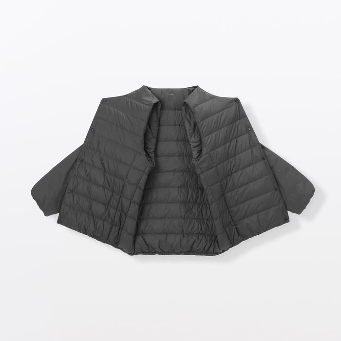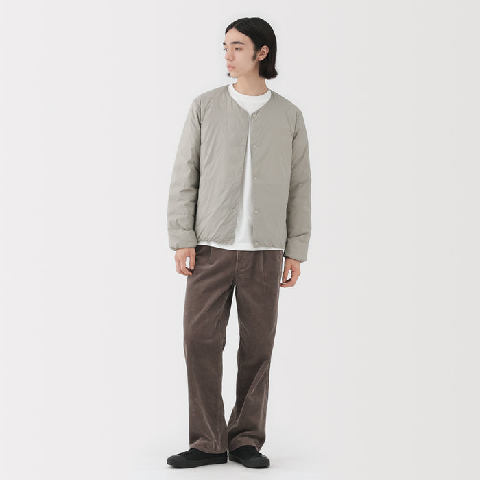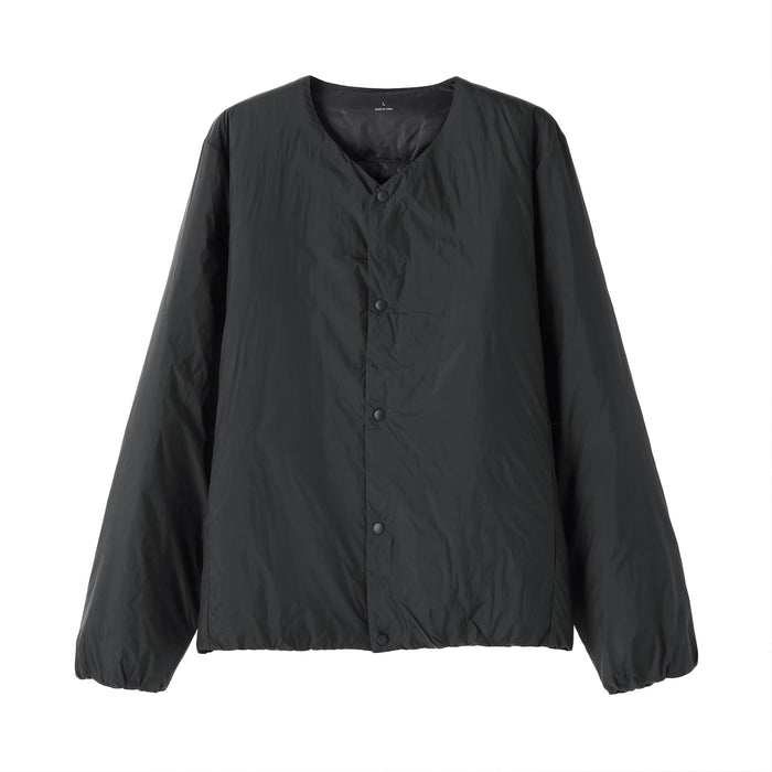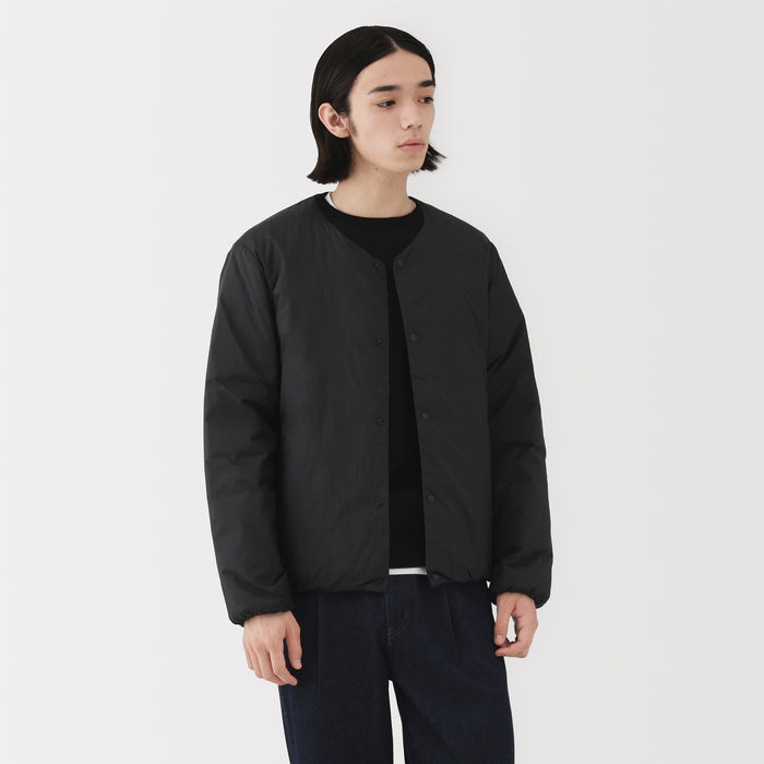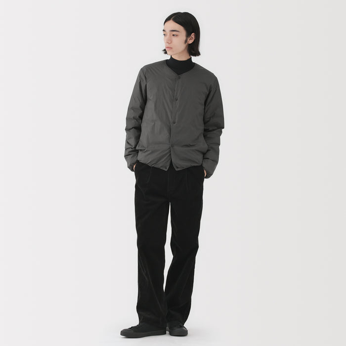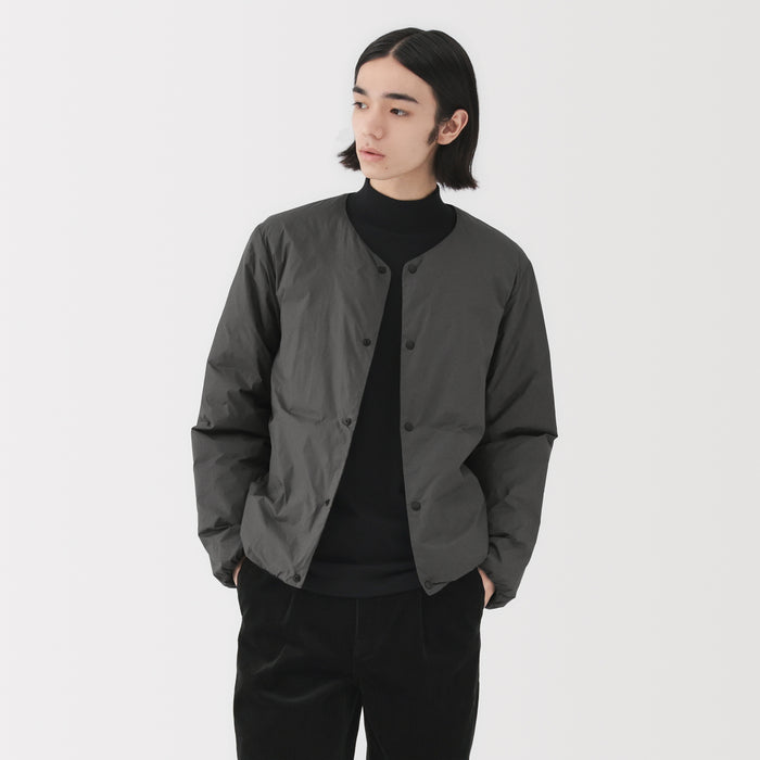A men's lightweight down collarless jacket made with recycled nylon fabric and fill power 750 down. Designed to be foldable and easy to carry. Thick and light enough to be layered in the winter.