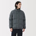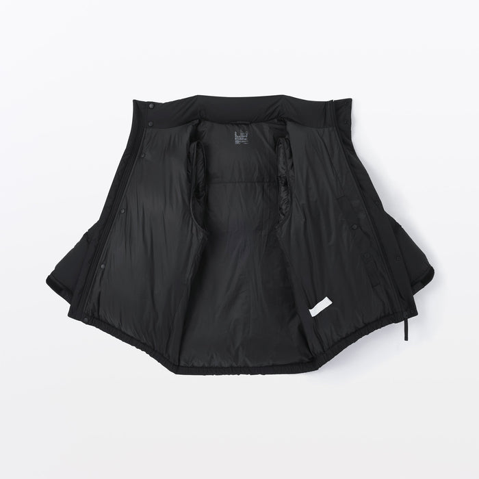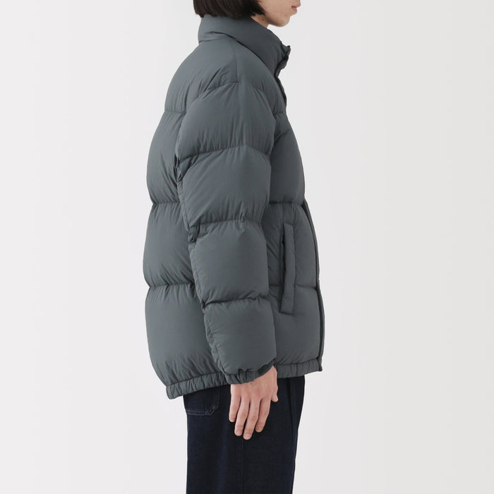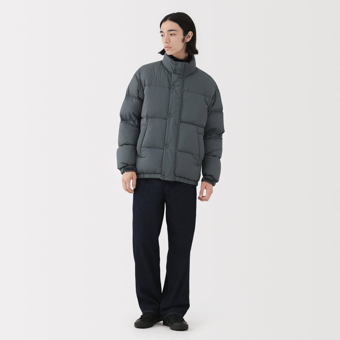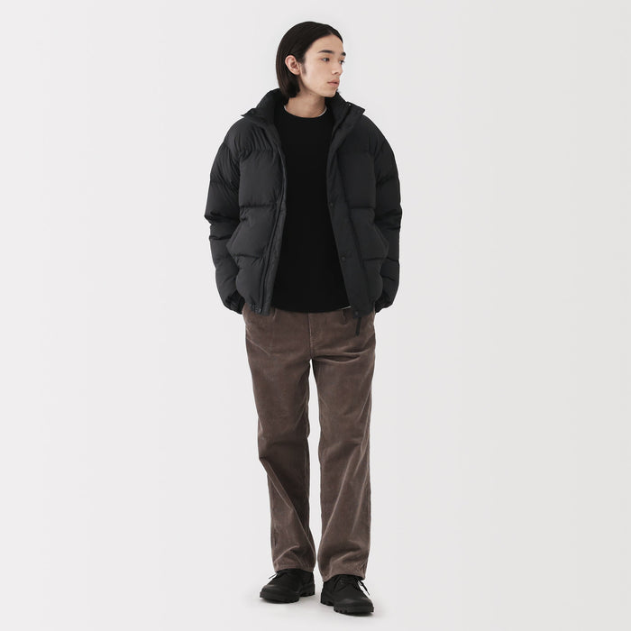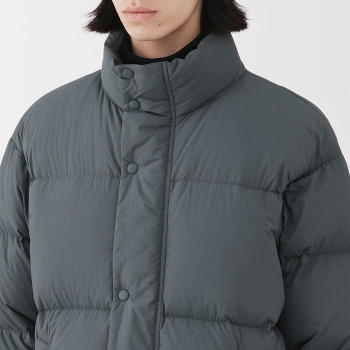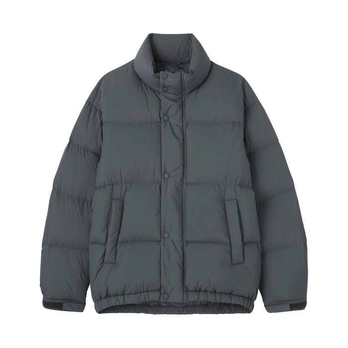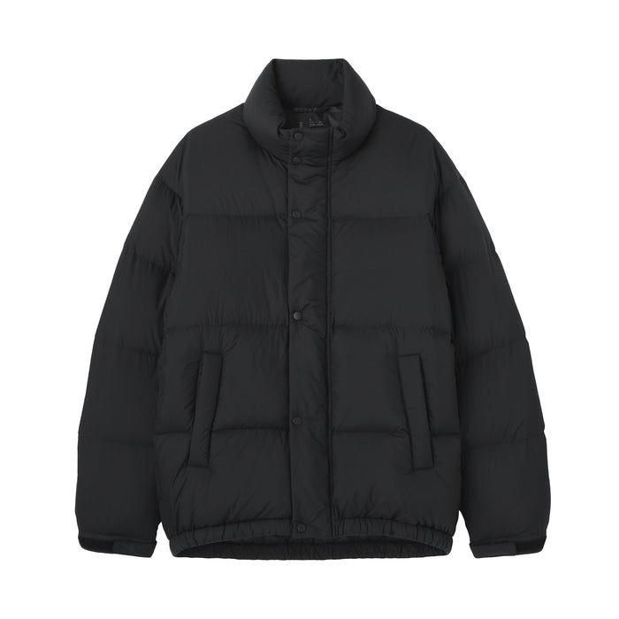 A men's lightweight down jacket made with recycled nylon fabric and fill power 750 down. Designed to be foldable and easy to carry. Thick and light enough to be layered in the winter.