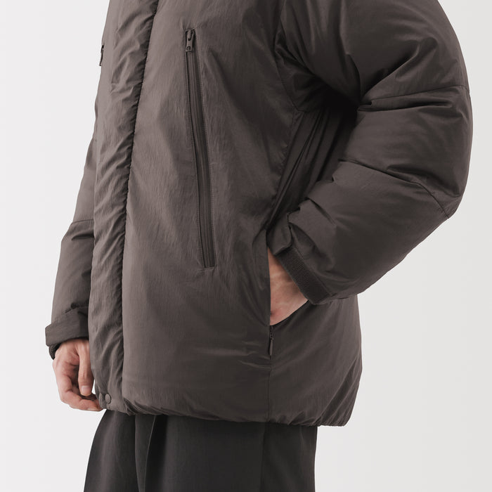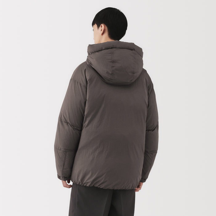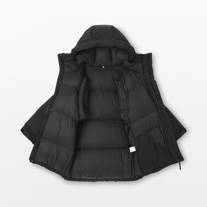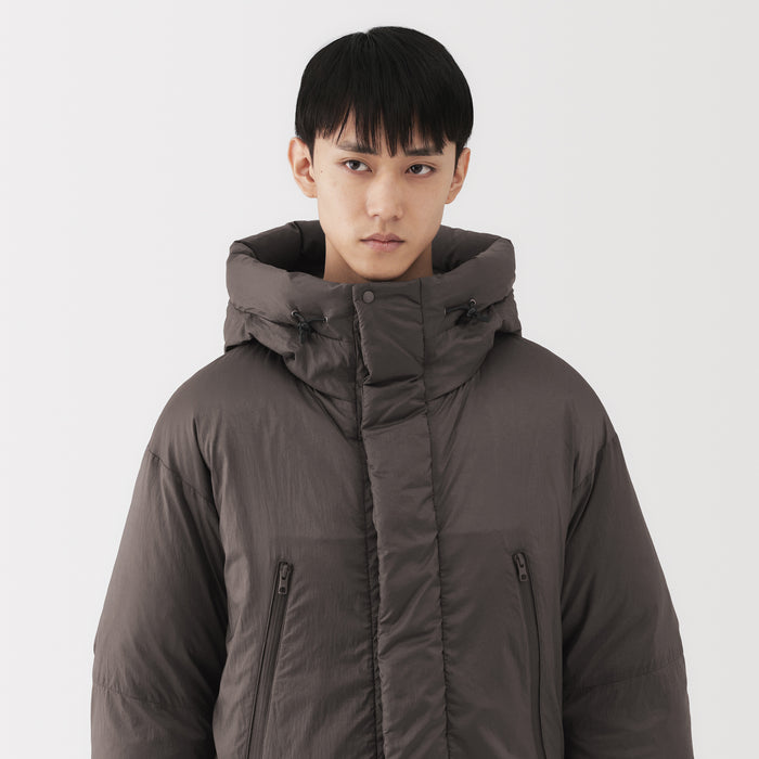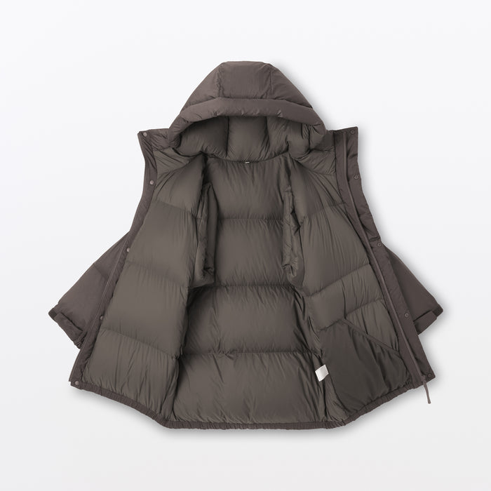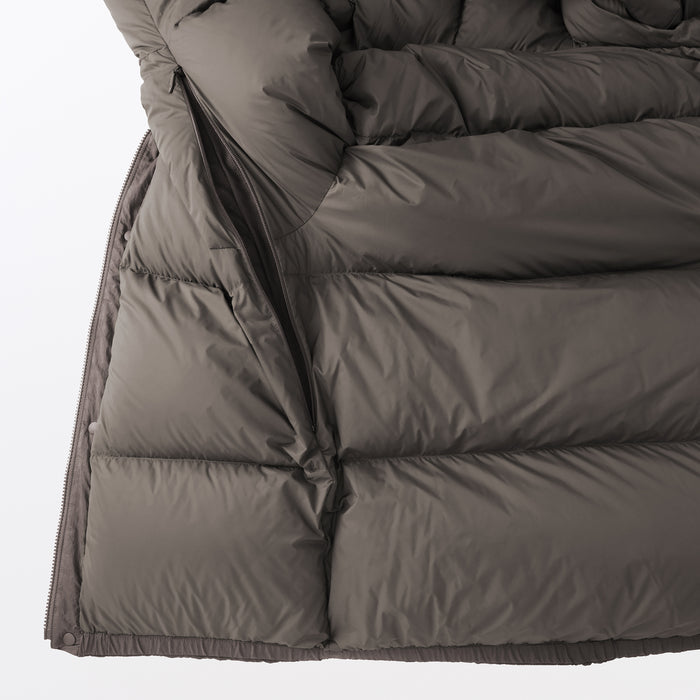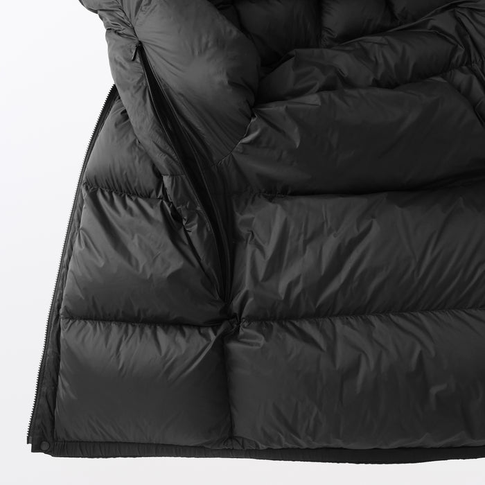This water repellent down jacket is made with soft 20 denier fabric and uses 750 fill power down for a fluffy and warm feel. The large hood will keep you dry and cozy in the cold and wet winter season. Features convenient pockets on the outside and inside of the jacket, and is also designed with zip-up mesh vents under the arms for breathability.