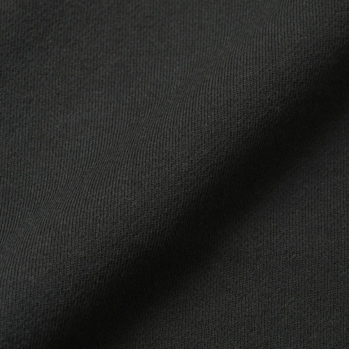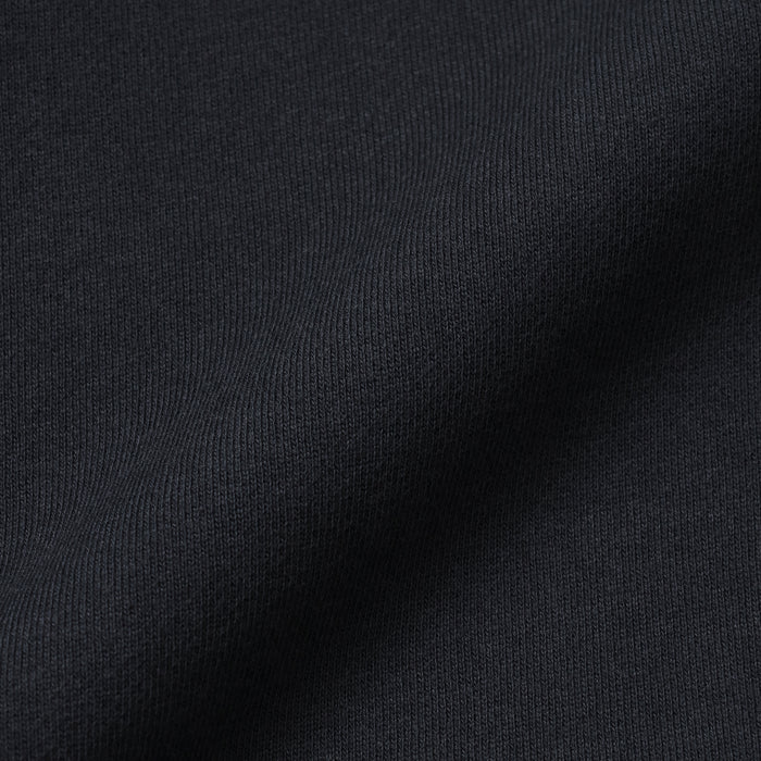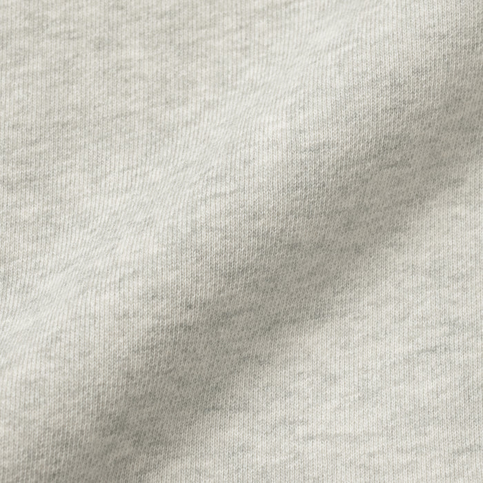 The fabric's softness is achieved by using a traditional loopwheel machine, which knits very slowly from bottom to top to remove unnecessary tension on the yarn. This slow, careful process ensures a high-quality material with a fluffy, airy texture that is only possible with traditional knitting methods. Because of this process, the material may feature natural irregularities like slightly uneven texture or stitching, adding character to each piece.