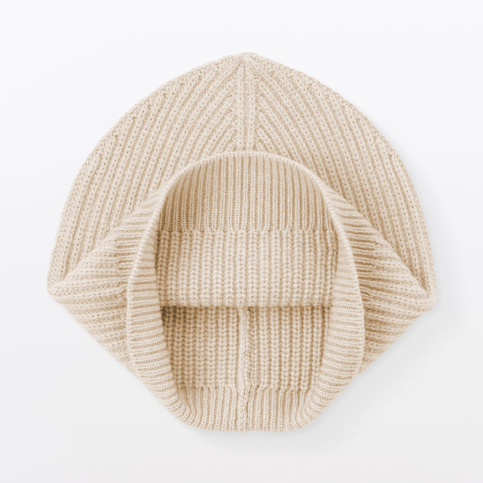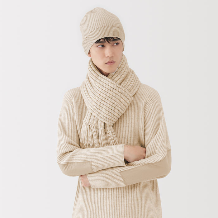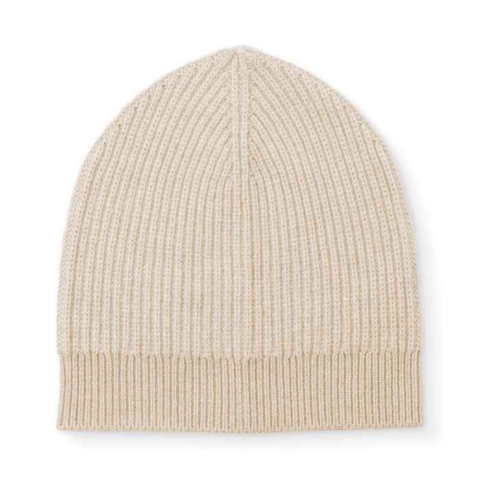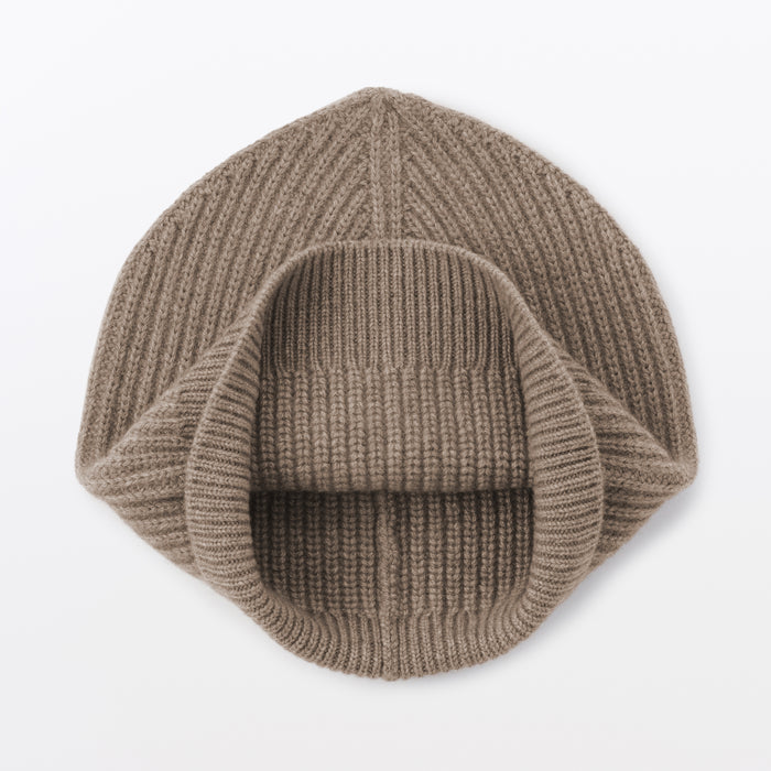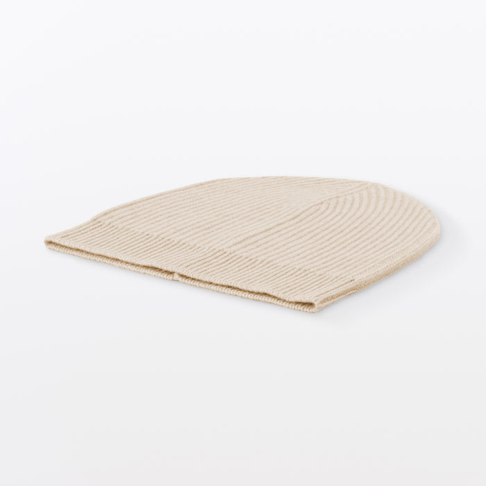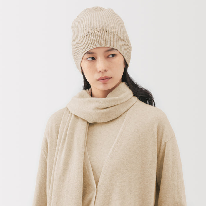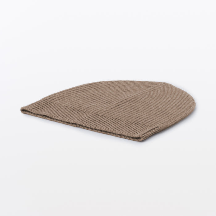 A slightly thick knitted cap made using downy winter hair of cashmere goats raised on the harsh cold Mongolian Plateau. The cashmere is left undyed and unbleached, so you can enjoy its natural color. Long fiber cashmere down creates a luxuriously soft and supple texture, wrapping you in a cozy warmth.