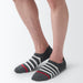 As the heel is at a right angle, the socks are knitted at a right angle to wrap comfortably around the heel and prevent the fabric from sagging and slipping off.