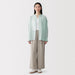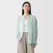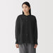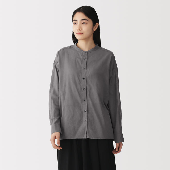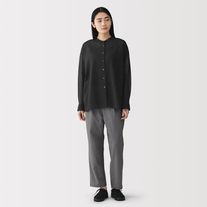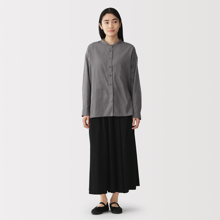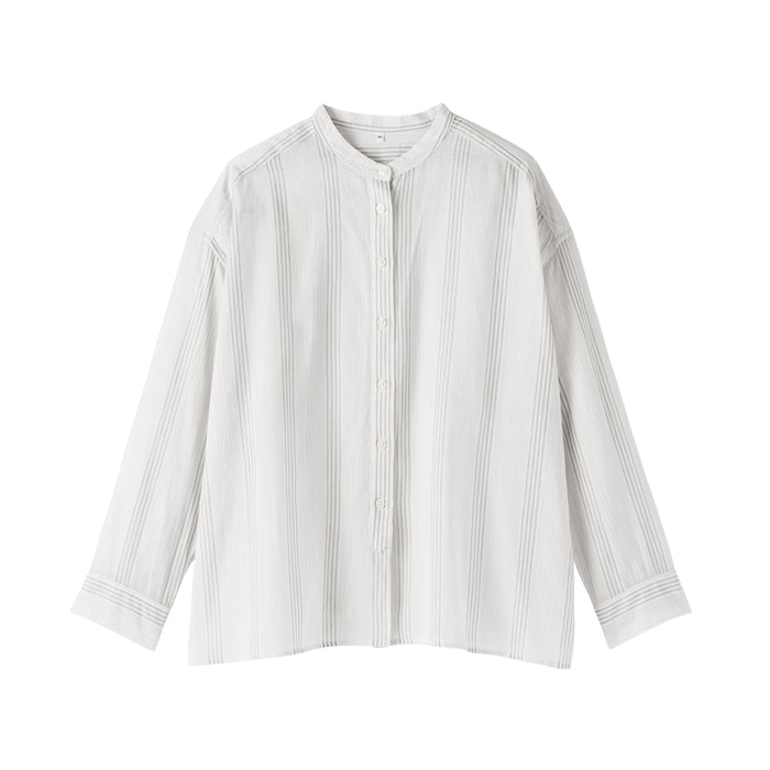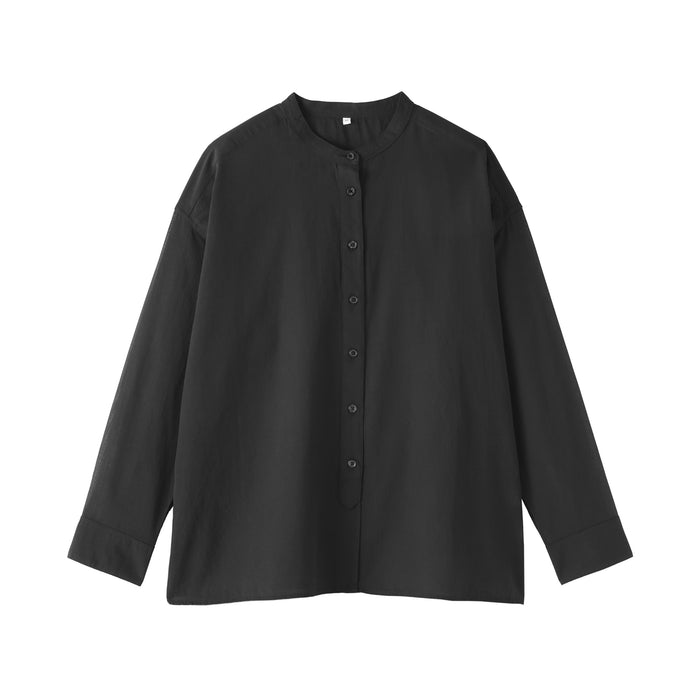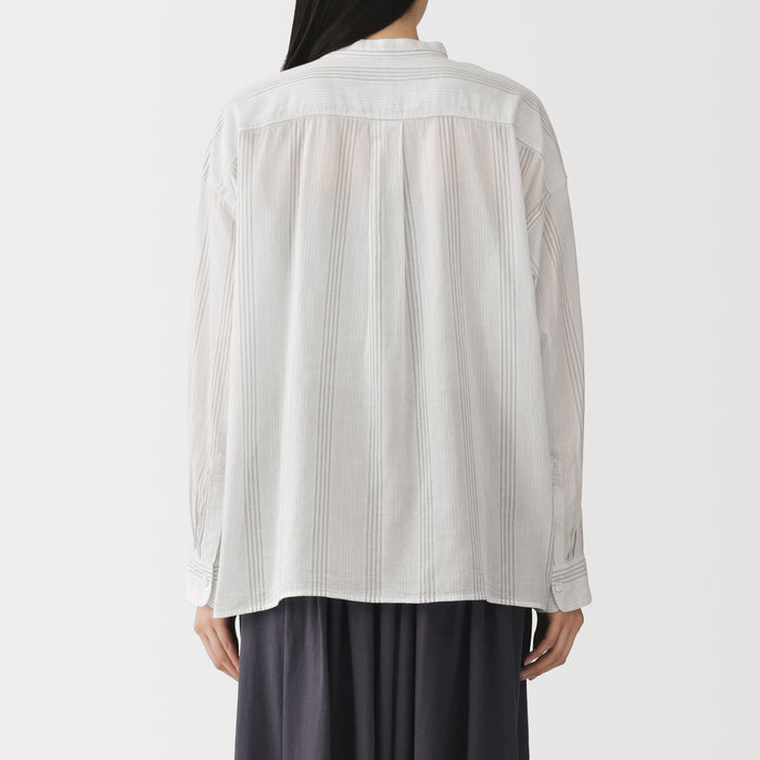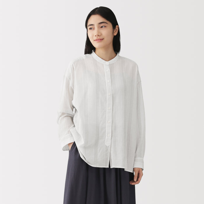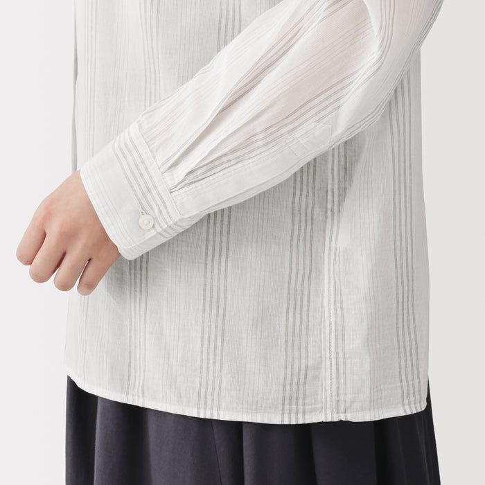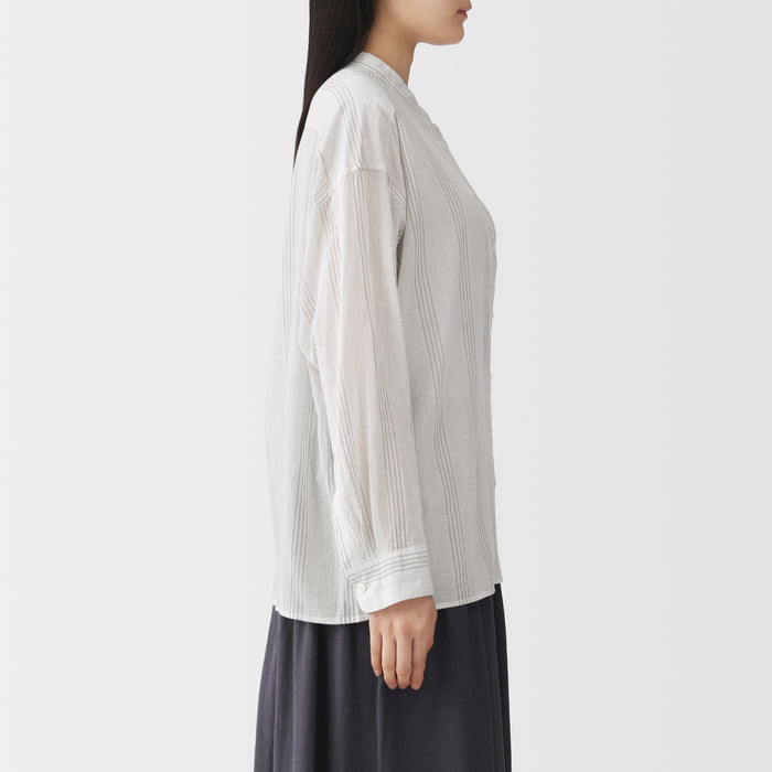 A women's button up long sleeve shirt with a slightly sheer fabric that's perfect on warm days. Made from high-twist organic cotton yarn for an airy, lightweight texture to keep you cool. It has a clean stand collar and a loose silhouette for comfortable movement and easy layering.
