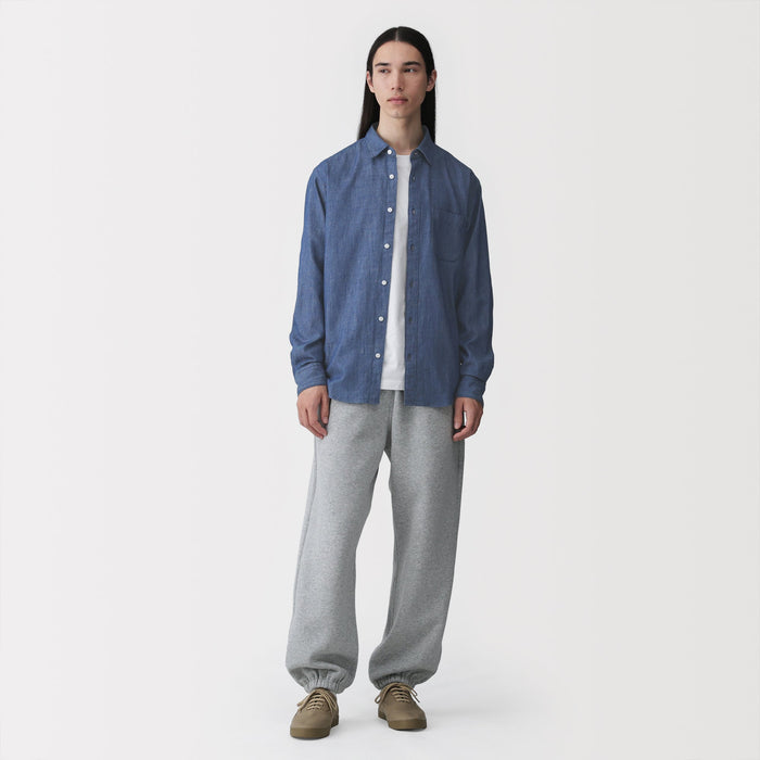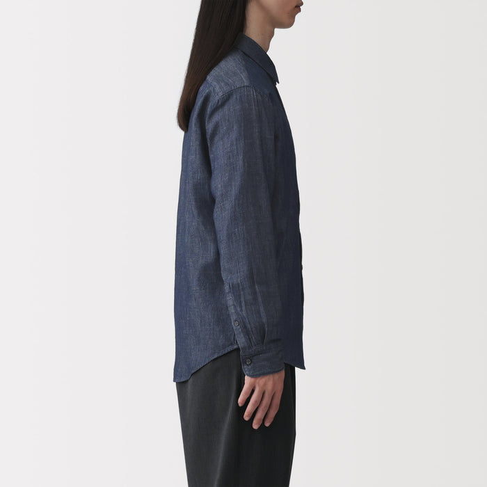 A classic men's button up shirt made with organic cotton denim material that fits better and feels softer with each wear and wash. It has a basic silhouette and rounded hem, making it great for layering with outerwear or sweaters in winter, and used as a jacket in early spring.