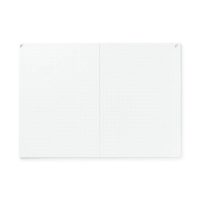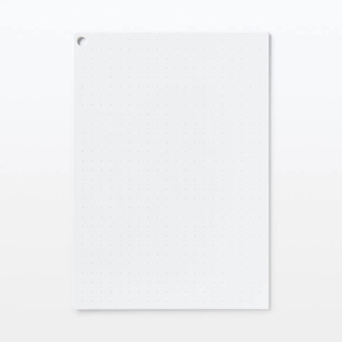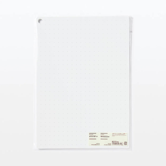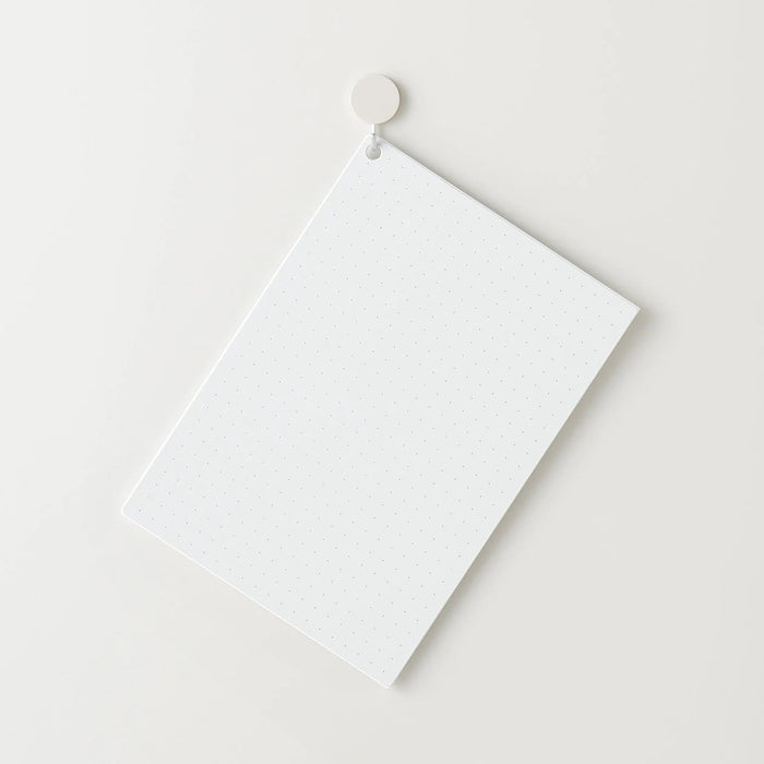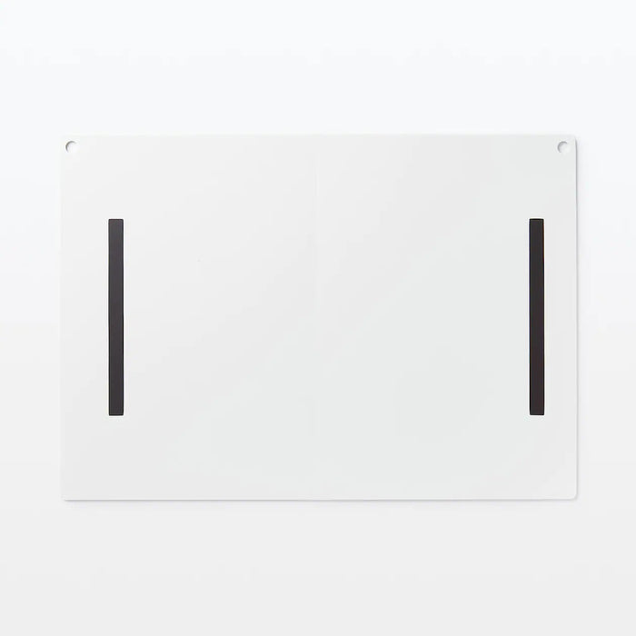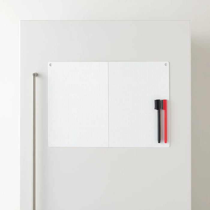 A portable whiteboard that can be conveniently folded and stored. Dots spaced 1cm apart on the board can be used as guide to make it easy to write or draw straight lines. Magnets on the back can be attached to your refrigerator. There are two holes that can be used to hang the board, whether it's open or folded.