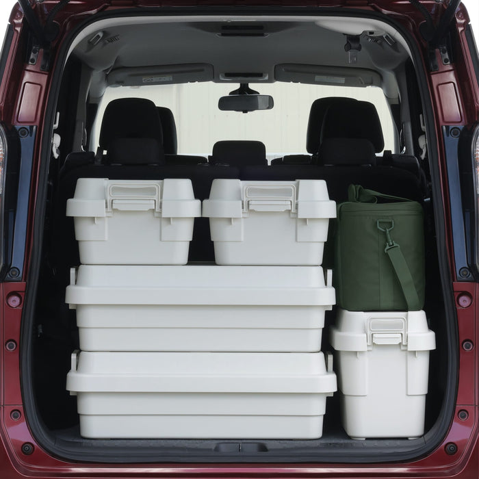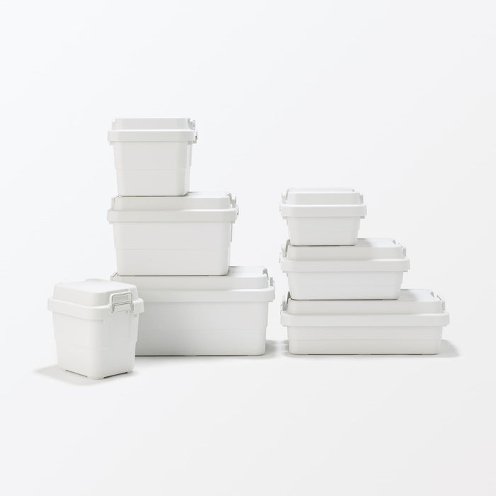 A sturdy and durable shallow storage box that can be used both indoors and outdoors. The shape of the lid is designed so that it does not slip even when stacked and is easy to use as a table or stool.