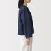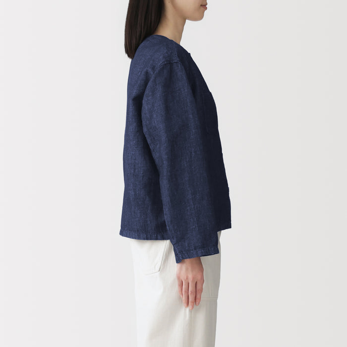 A women's button-up shirt with a boxy silhouette made with twilled hemp and organic cotton for a soft denim material that's comfortable and breezy. It has a jacket-like style, designed with 9/10 sleeves and a slightly shorter length.
