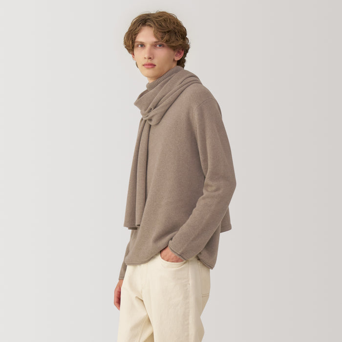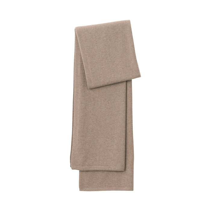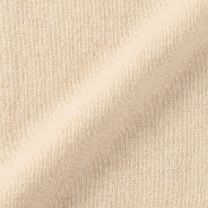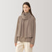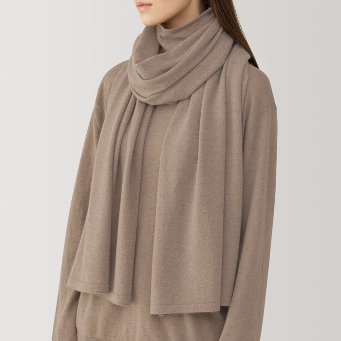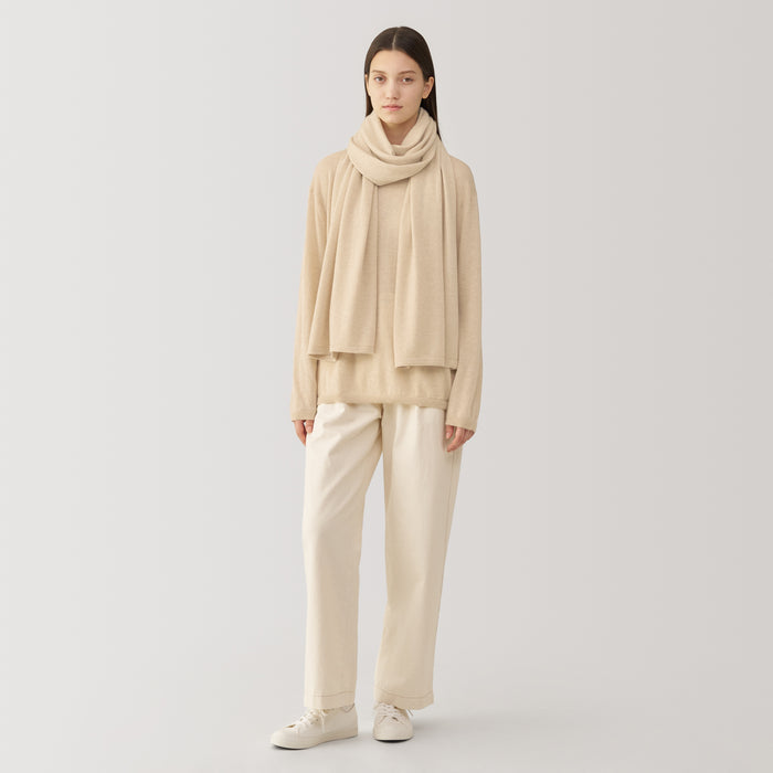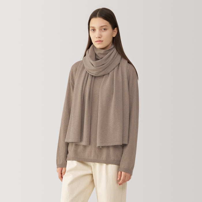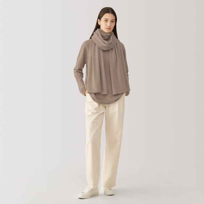 A stole knitted in a soft jersey stitch, made using undyed and unbleached winter, downy hair of cashmere goats raised on the harsh cold Mongolian Plateau. The long fiber cashmere down creates a luxuriously soft and supple texture, while the large, voluminous size wraps you in a very comfortable, cozy warmth.