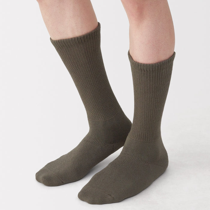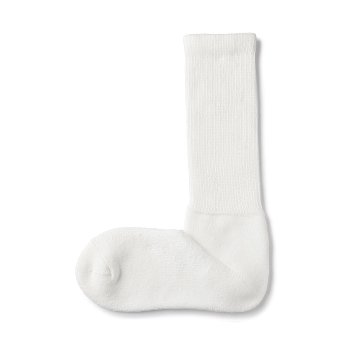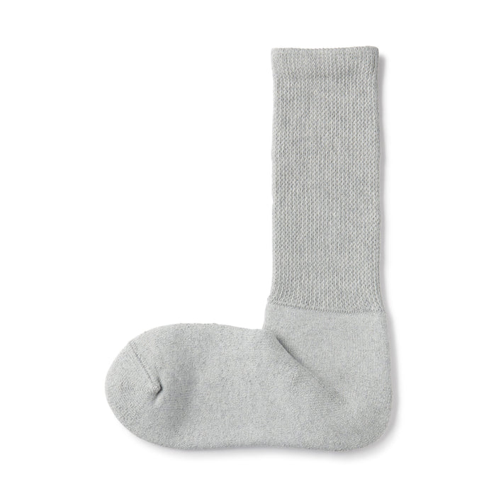 As the heel is at a right angle, the socks are knitted at a right angle to wrap comfortably around the heel and prevent the fabric from sagging and slipping off. Pile-knitted to create soft texture using cotton-rich yarn. The top cuff is designed to be less tight so it is more comfortable to wear.