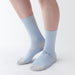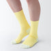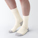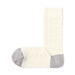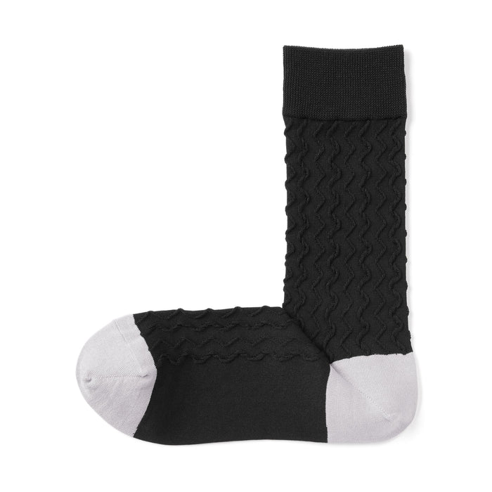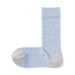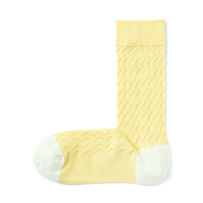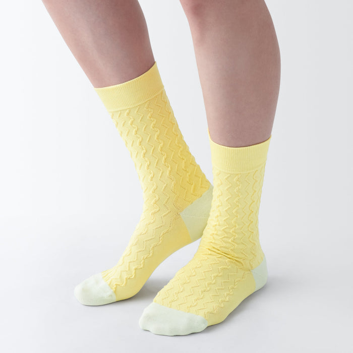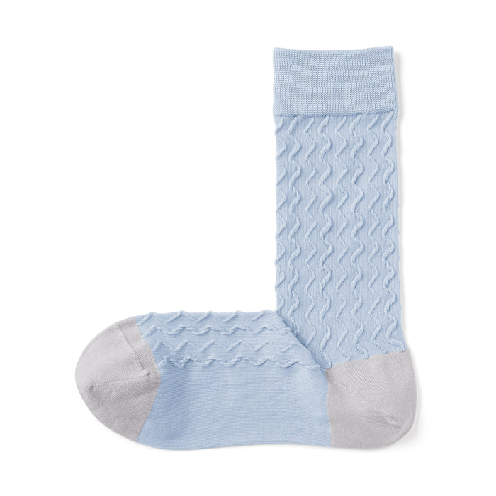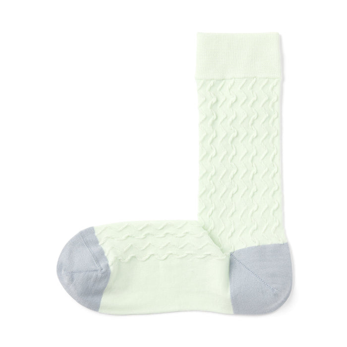 Crew socks with a pattern stitch, made using lustrous cotton yarn which makes the socks appear bright, glossy, and shiny. The heel of the socks are knitted at a right angle to wrap comfortably and naturally around the heel.