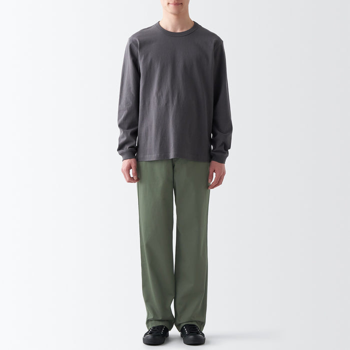 Durable men's chinos made from supple organic cotton for comfort. They have a loose fit silhouette and high rise waistband that is suitable for everyday wear. Inseam: 32" (82 cm).