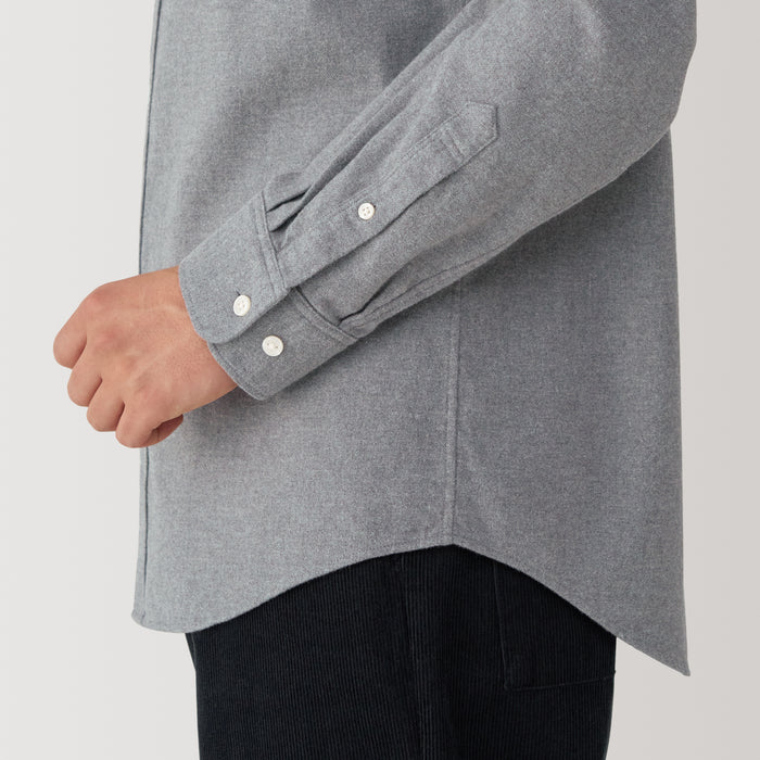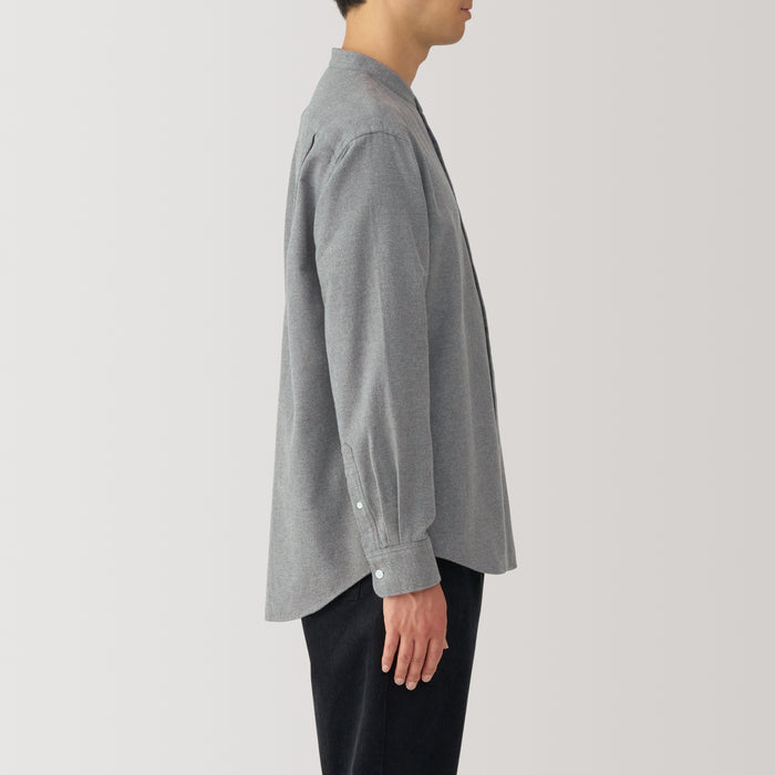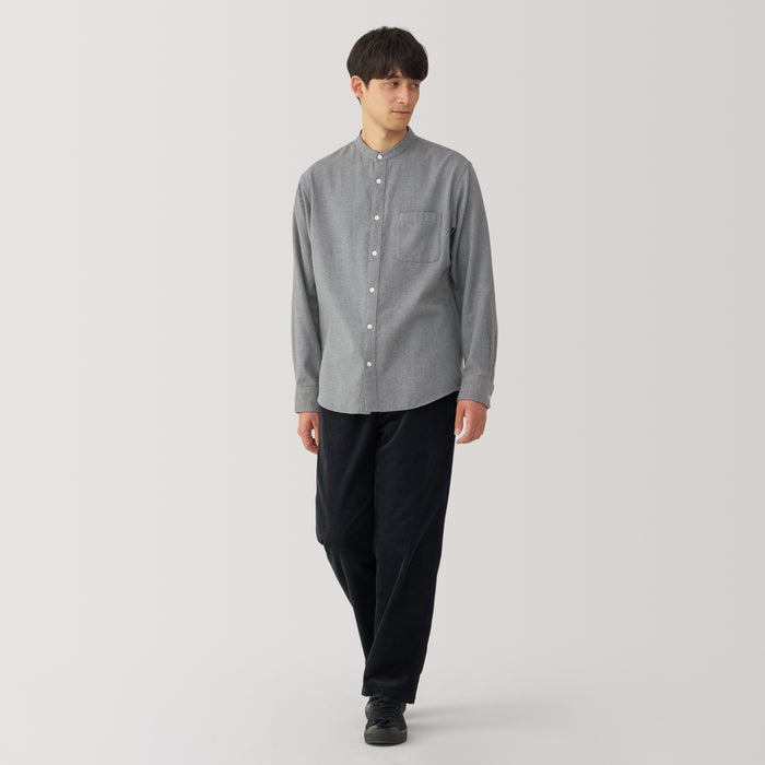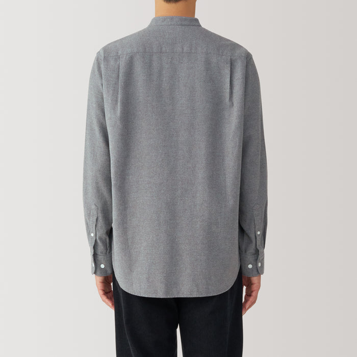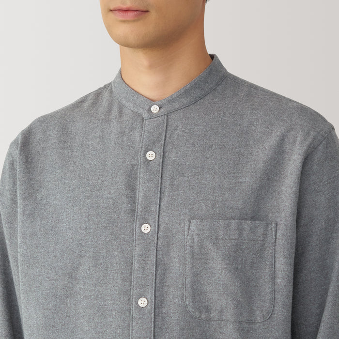 A stand collar flannel shirt that you'll want to wear when the morning and evening air feels cool. The special brushing process gives it a unique texture so it can become a useful daily fit for you during the fall and winter months. Regular fit.