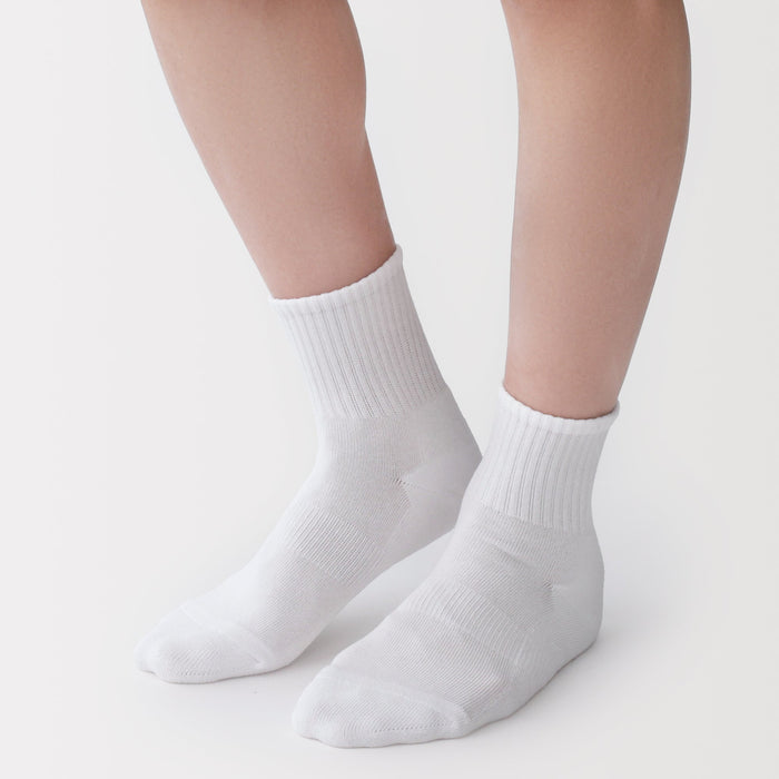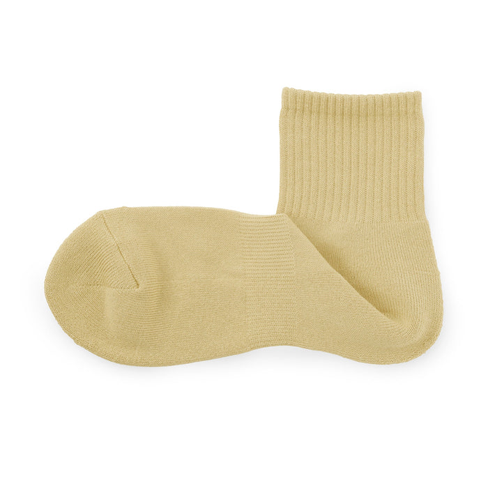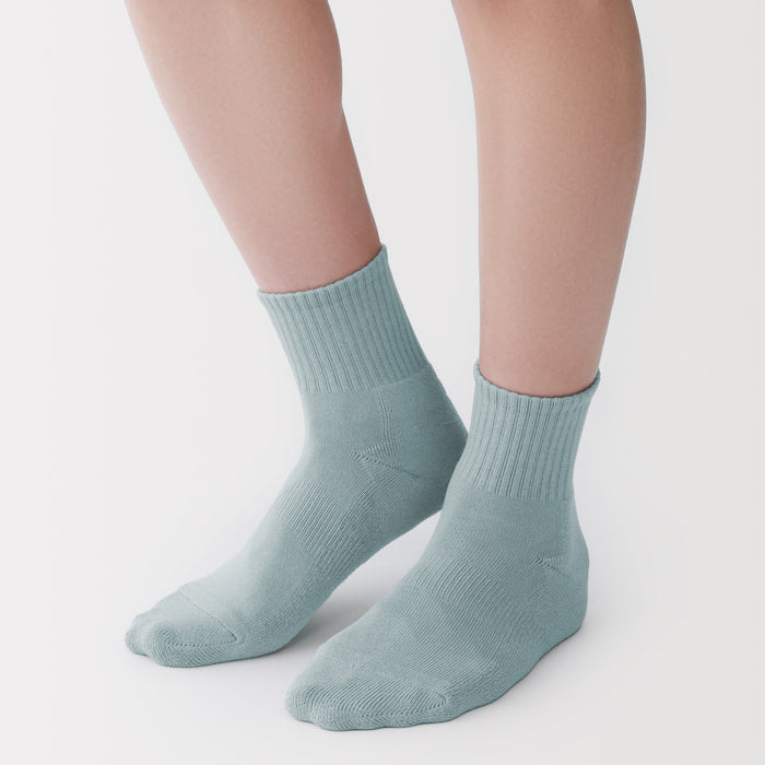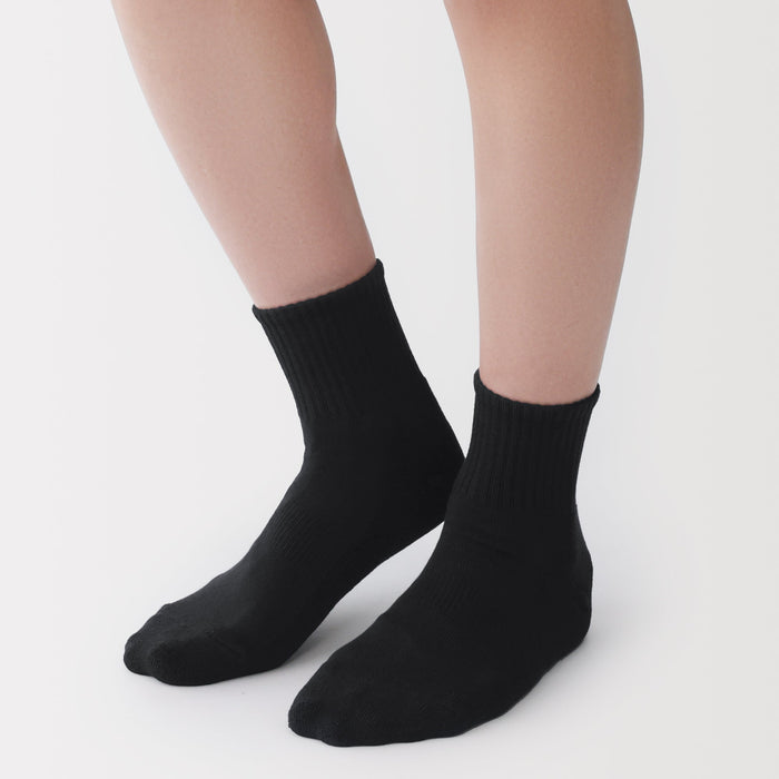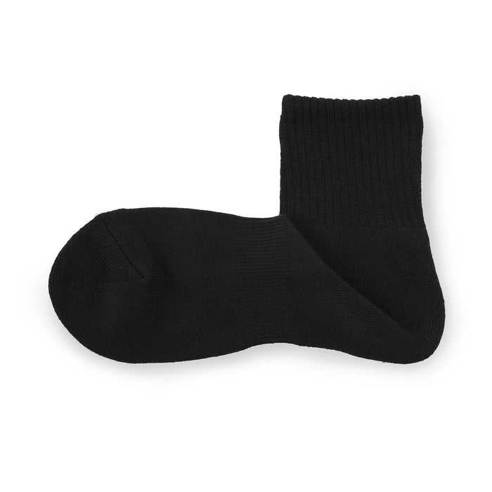 Soft pile-knitted sole with a sweat de-odorizing effect. The heel of the socks is knitted at a right angle to wrap comfortably and naturally around the heel.