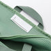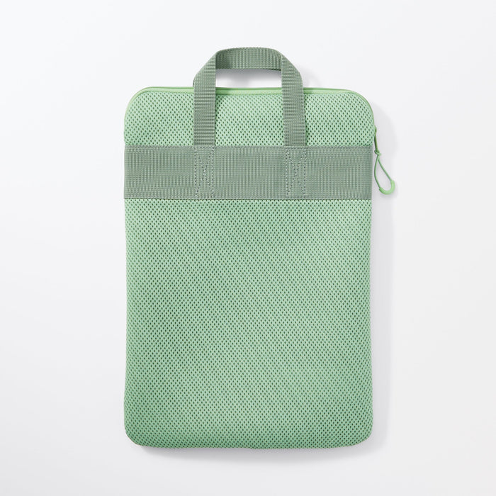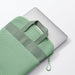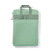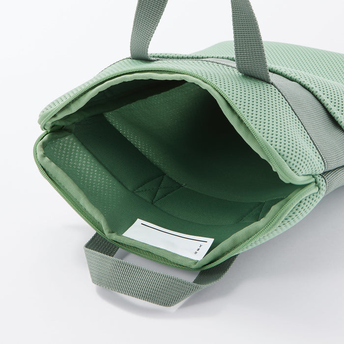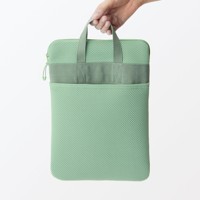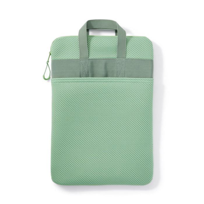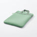 A green tablet carrying case made from lightweight, cushioned material. Its vertical design and carrying straps make it easy to hold and remove from a backpack. There is a label on the inside to print your name for identification.