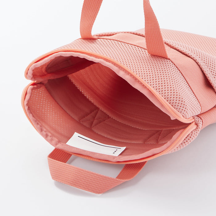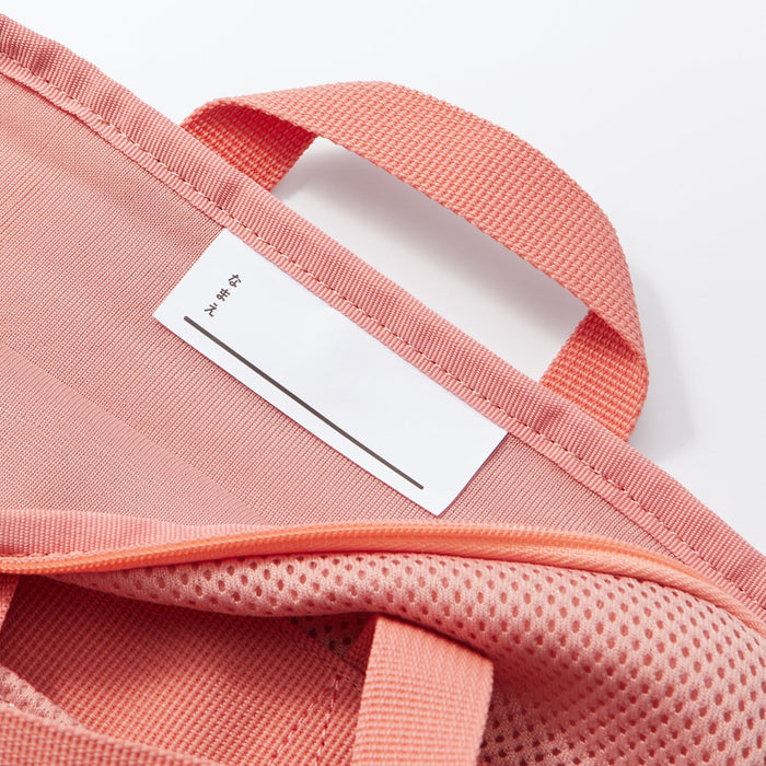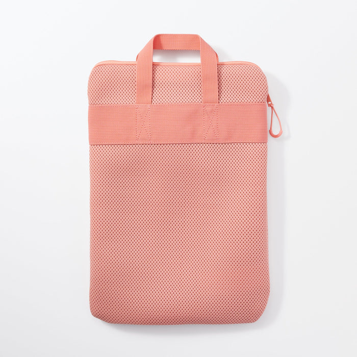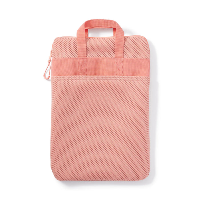 A pink tablet carrying case made from lightweight, cushioned material. Its vertical design and carrying straps make it easy to hold and remove from a backpack. There is a label on the inside to print your name for identification.