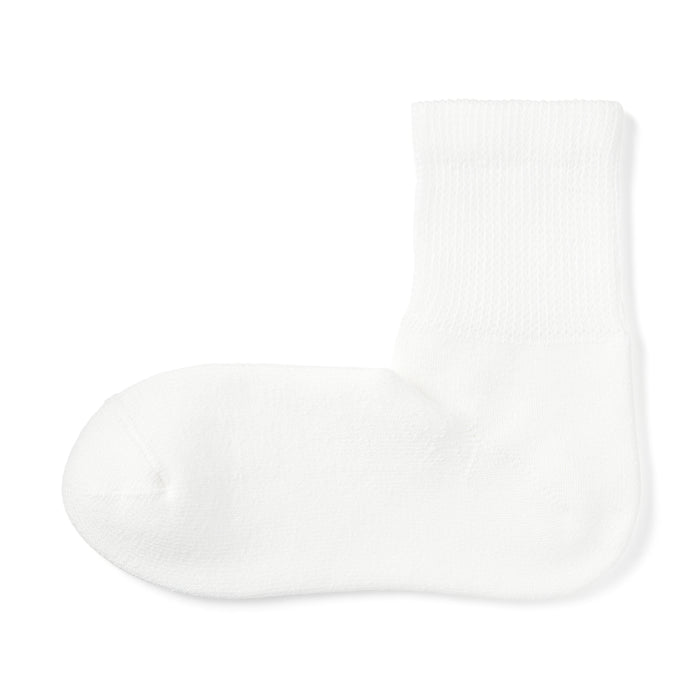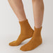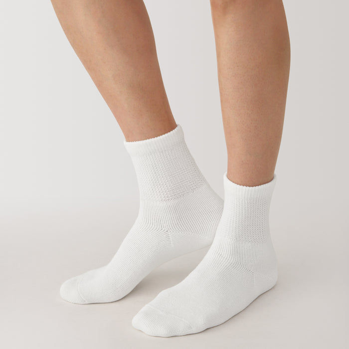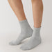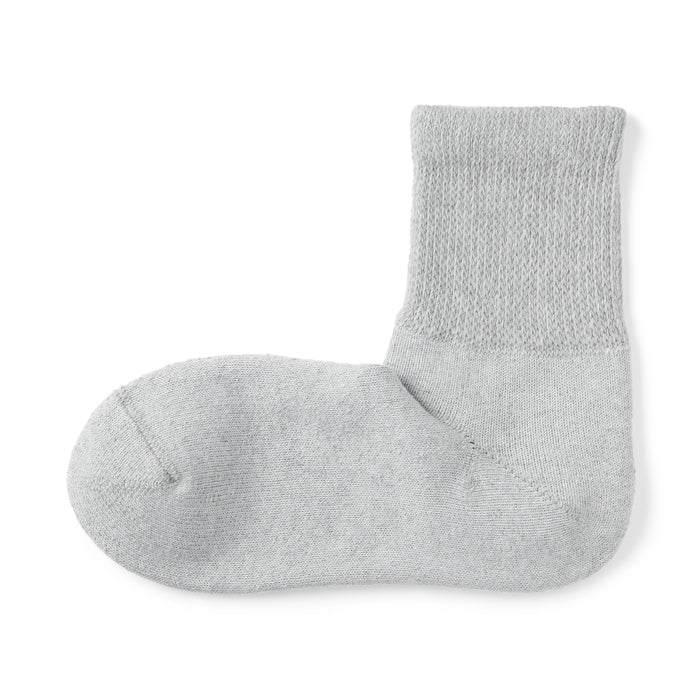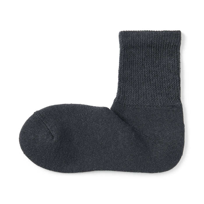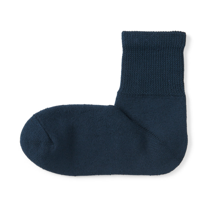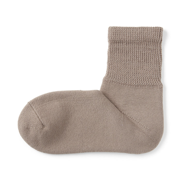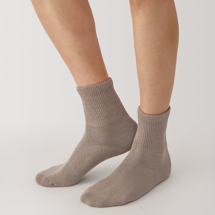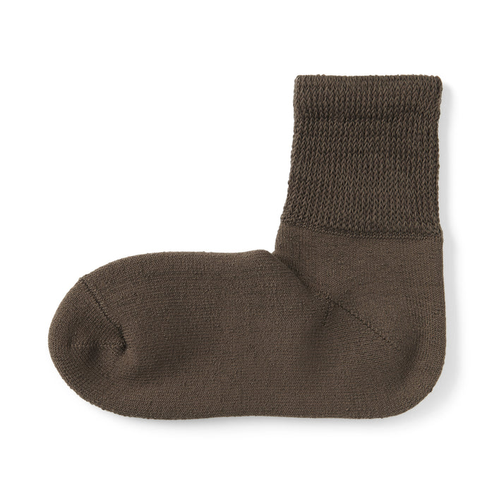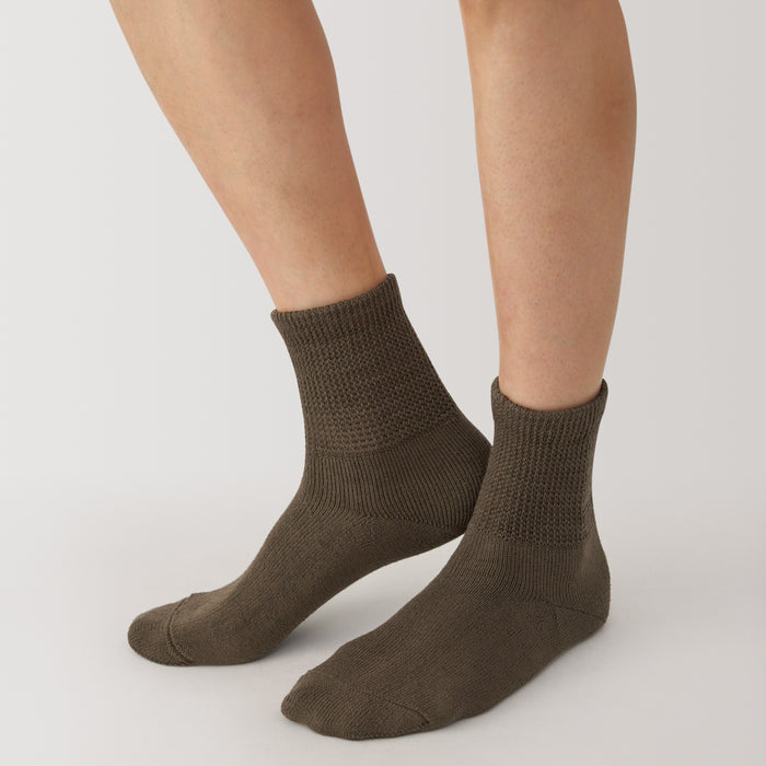 As the heel is at a right angle, the socks are knitted at a right angle to wrap comfortably around the heel and prevent the fabric from sagging and slipping off. Pile-knitted to create soft texture using cotton-rich yarn. The top cuff is designed to be less tight so it is more comfortable to wear.