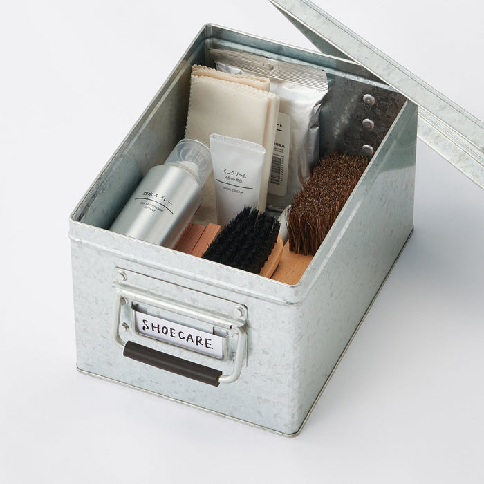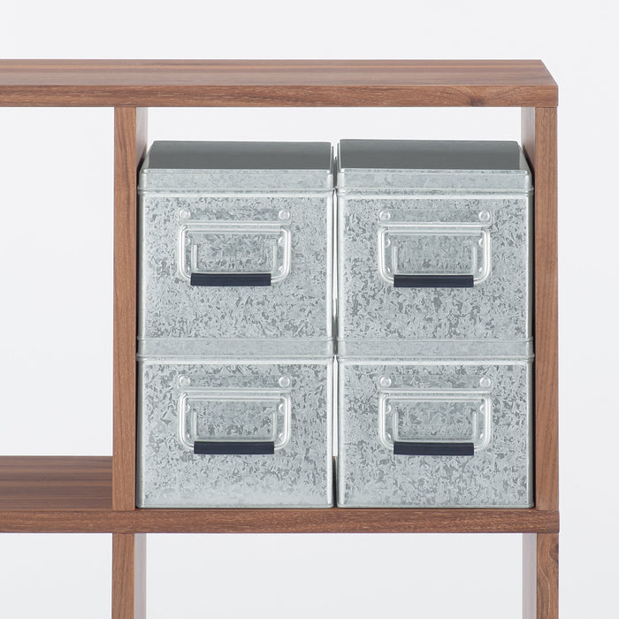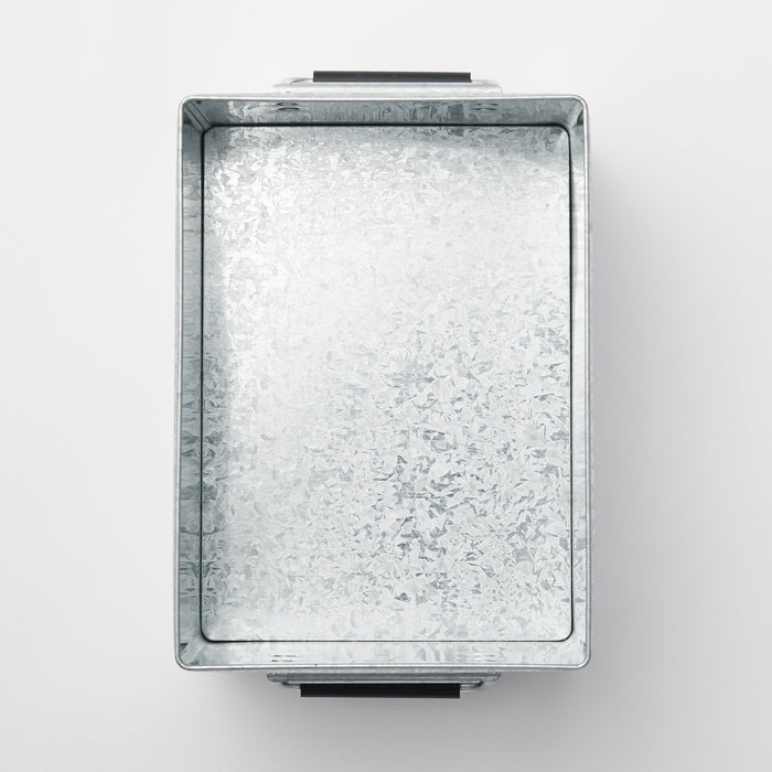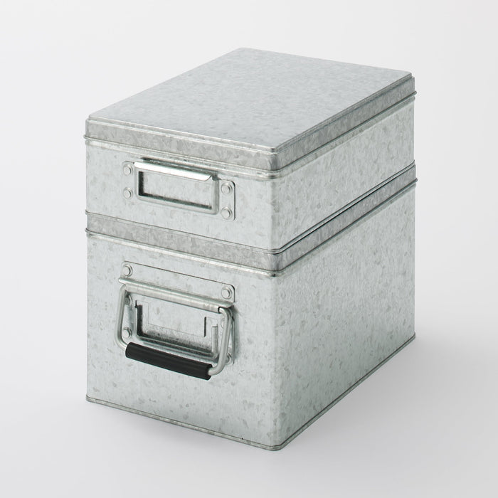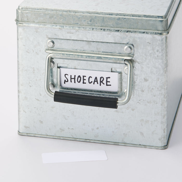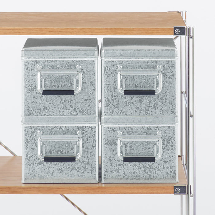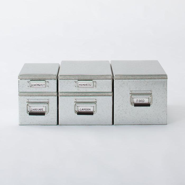 Made from rust-resistant galvanized tin, these stackable tin boxes are lightweight and durable, making them great for both indoor and outdoor storage use. They are designed to prevent shifting even when stacked, allowing for effective use of space when placed on shelves. The handles have room for labels quickly to identify the contents from the outside.