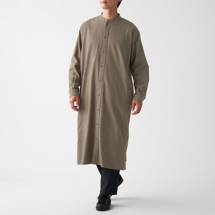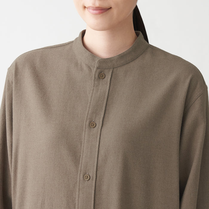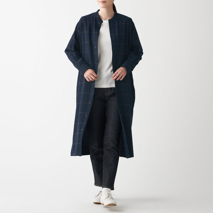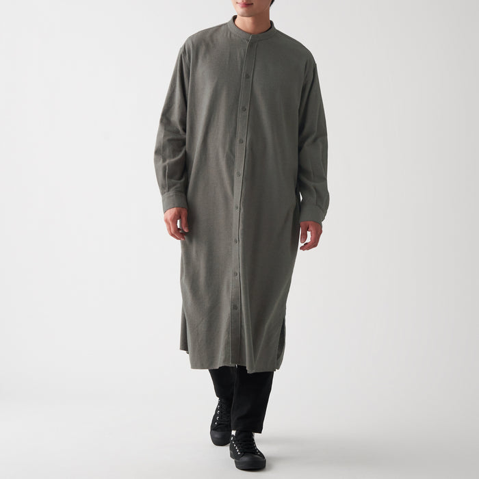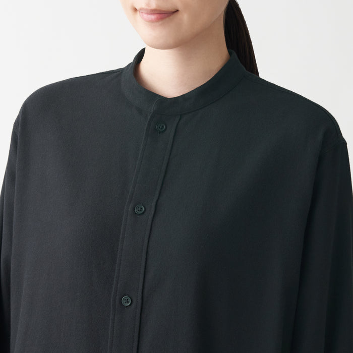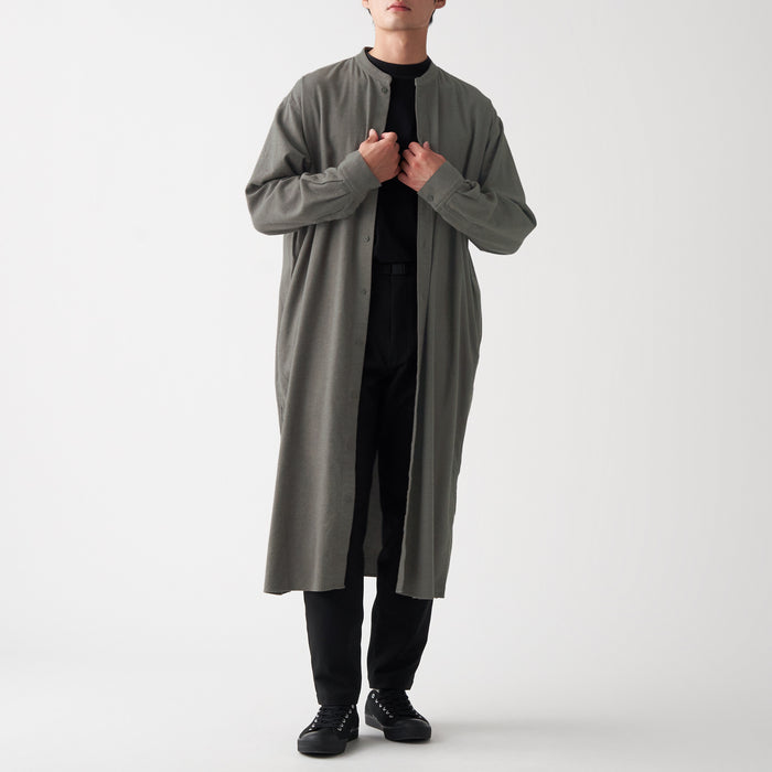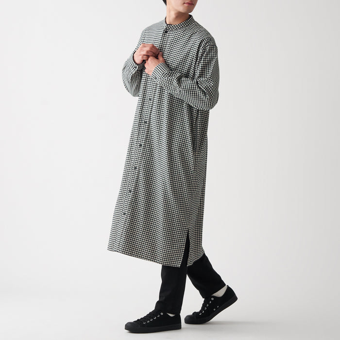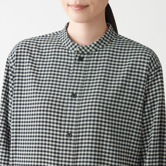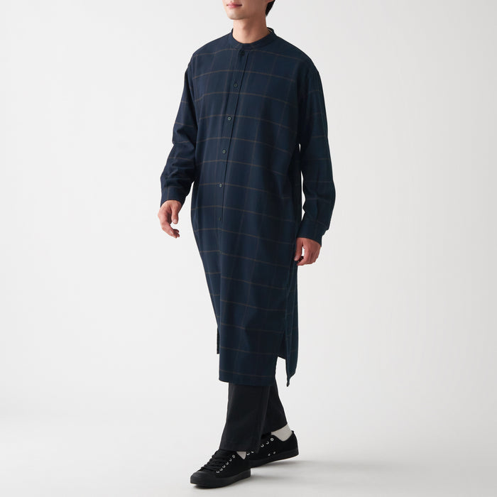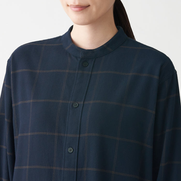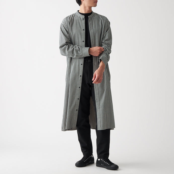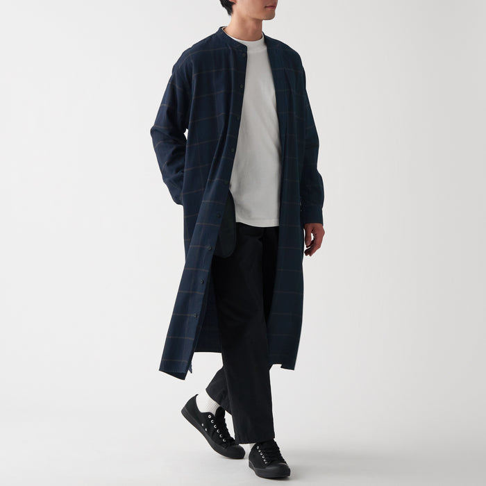 A unisex flannel shirt with a banded collar. The oversized length of the shirt creates a looser, more comfortable fit.