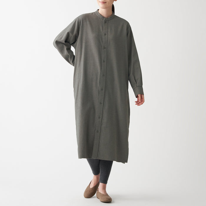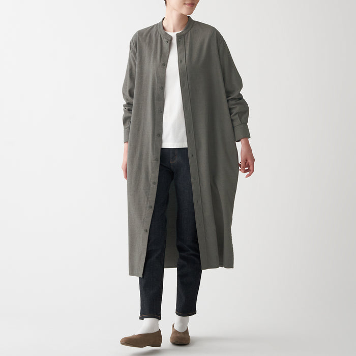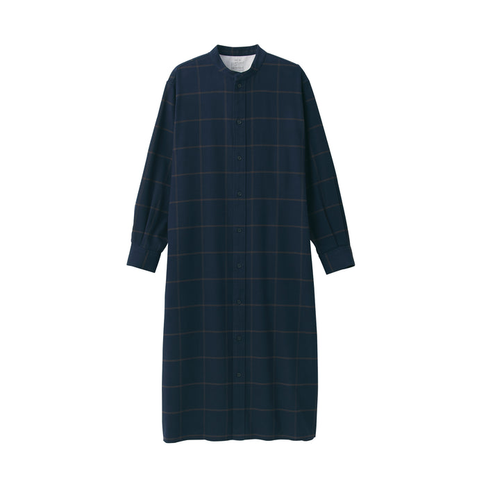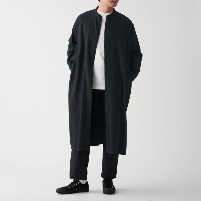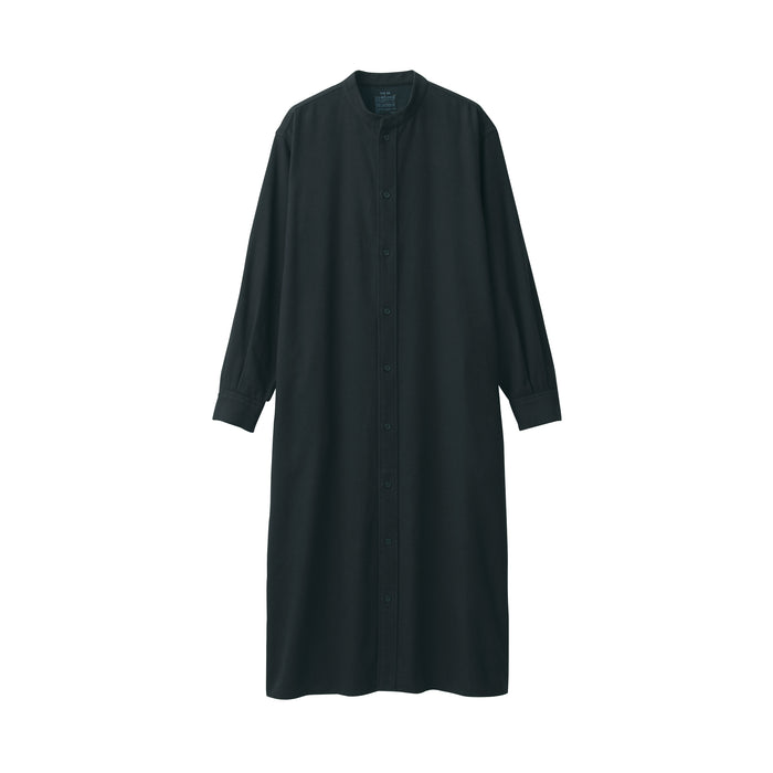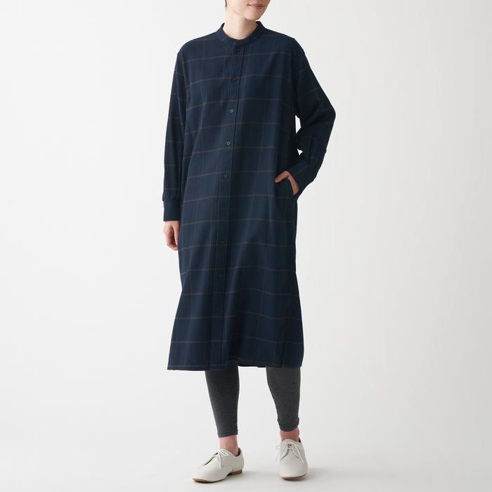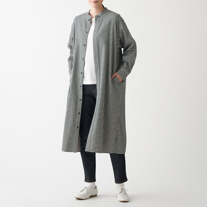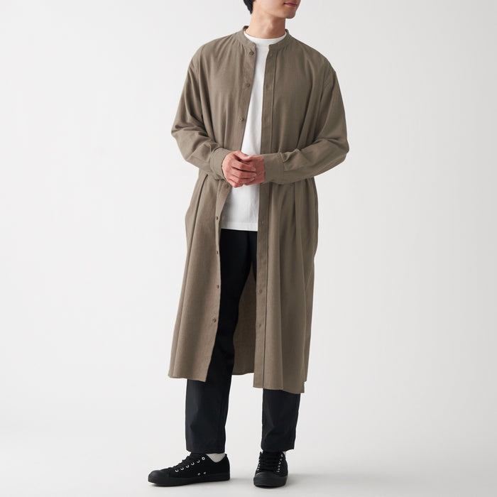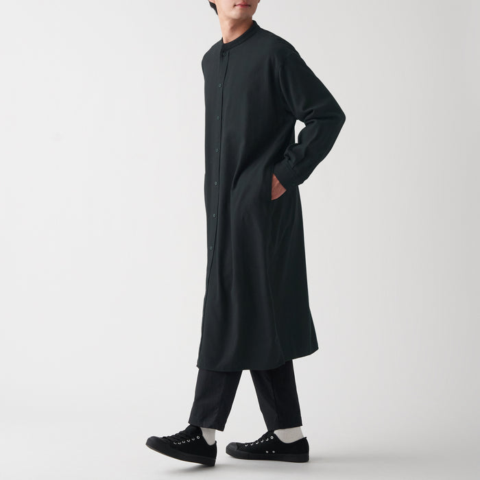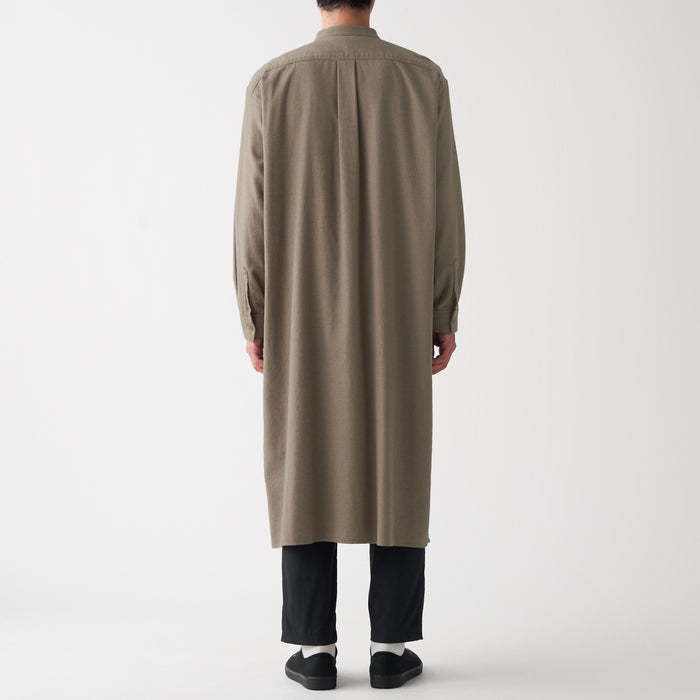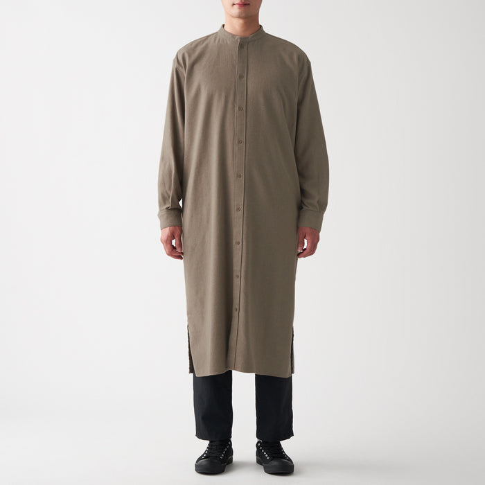 A unisex flannel shirt with a banded collar. The oversized length of the shirt creates a looser, more comfortable fit.