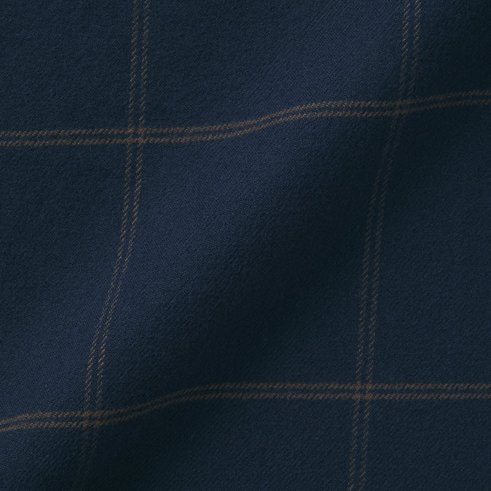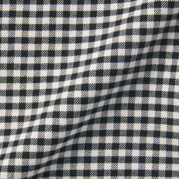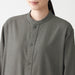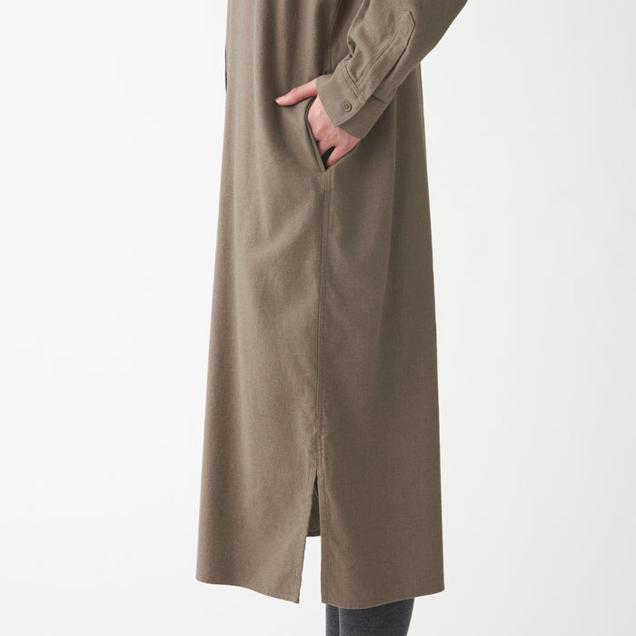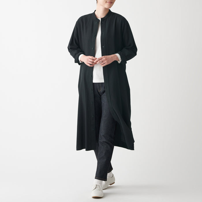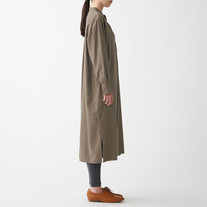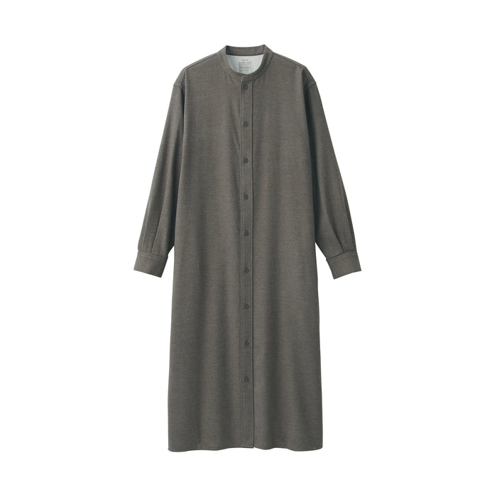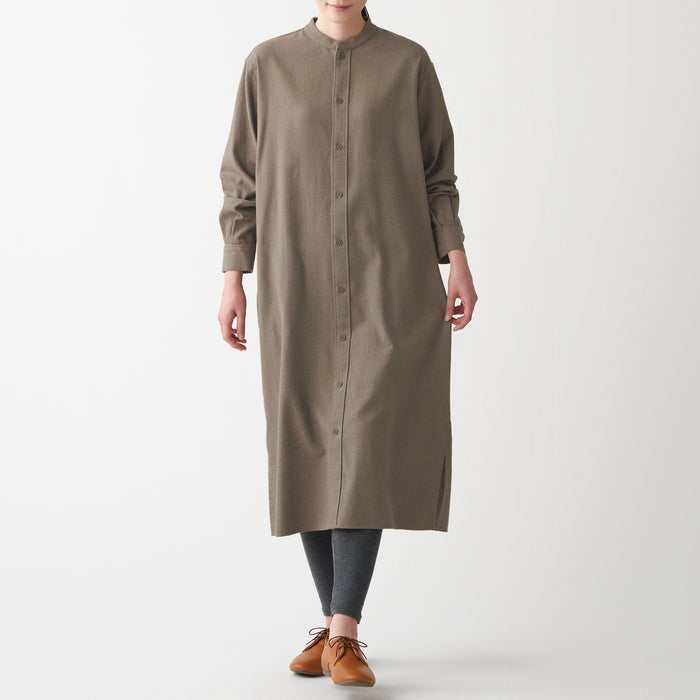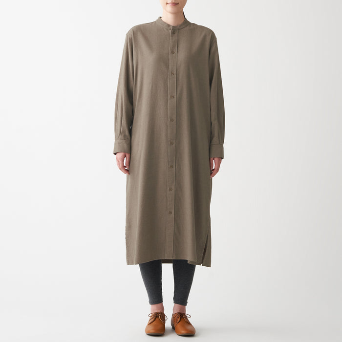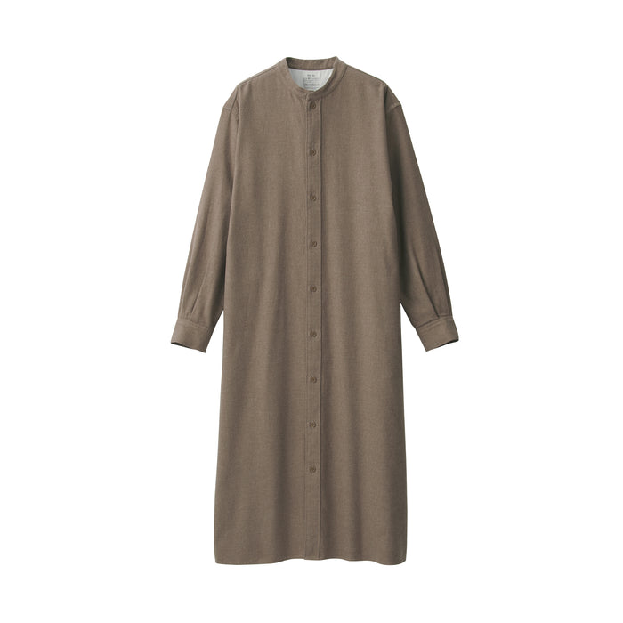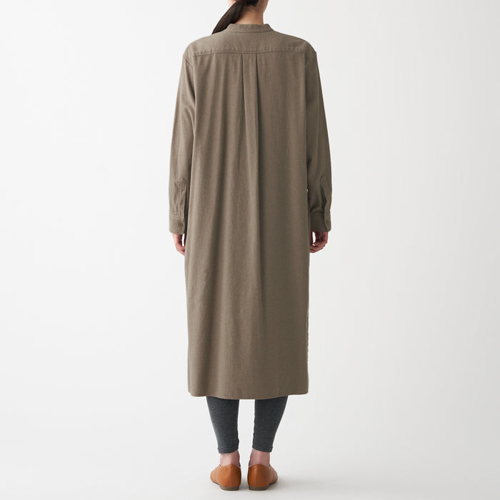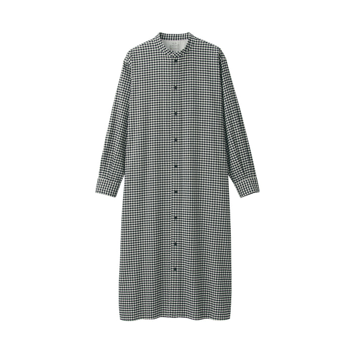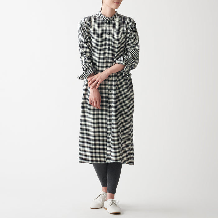 A unisex flannel shirt with a banded collar. The oversized length of the shirt creates a looser, more comfortable fit.