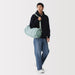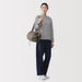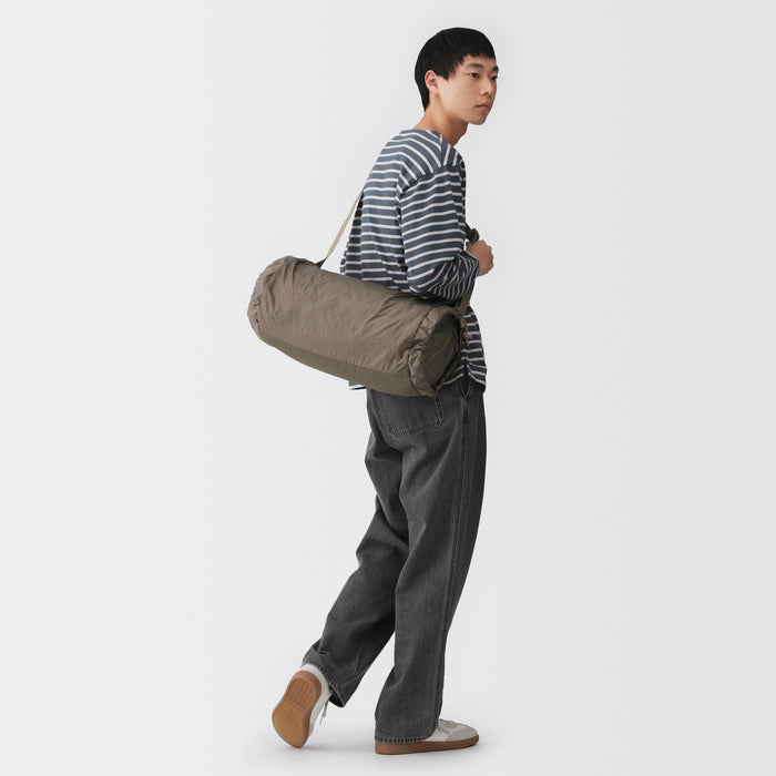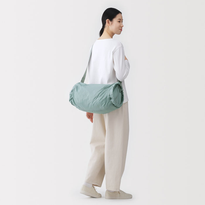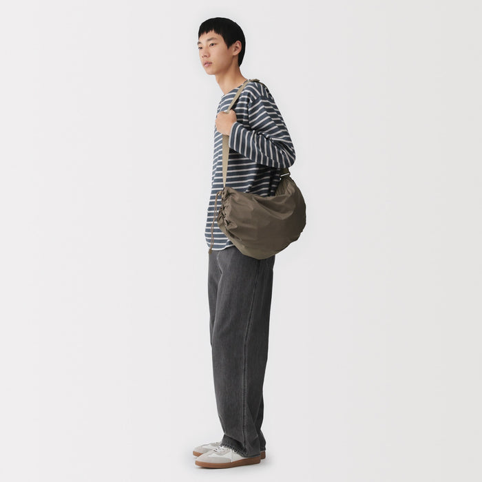 This shoulder bag is made of lightweight and durable ripstop fabric, featuring drawstrings on the ends that allow you to change its shape. There is also a pocket at the side that makes it easier to take things out when wearing. It has a basic design that can be used for a wide range of occasions, from everyday use and going to the gym, to outdoor activities like hiking. Wearable on your shoulder or as a crossbody, it is also great as a secondary bag for travel.